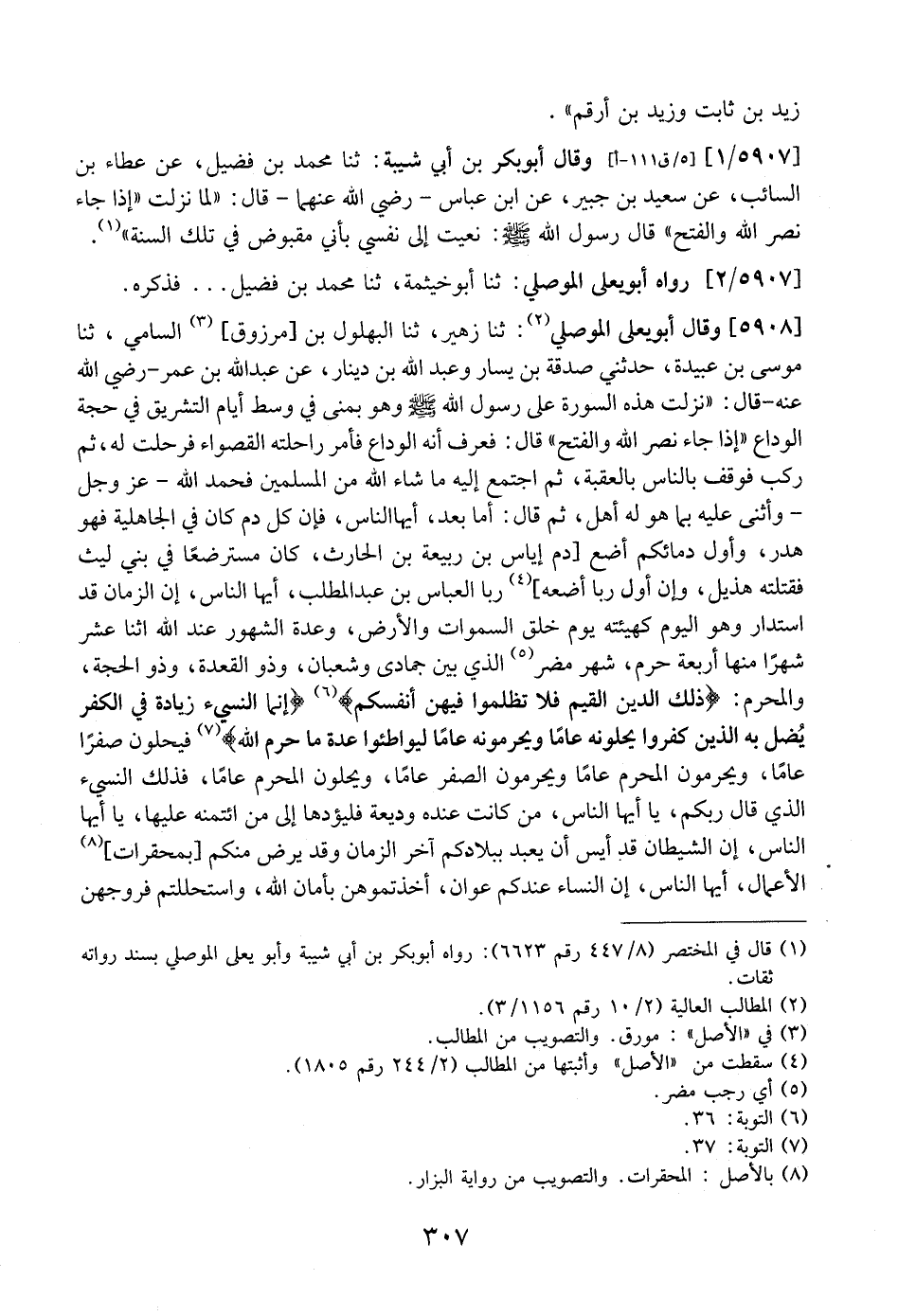 5908 - وَقَالَ أَبُو يَعْلَى الْمَوْصِلِيُّ: ثَنَا زُهَيْرٌ، ثَنَا البهلول بن مرزوق، السَّامِيُّ، ثَنَا مُوسَى بْنُ عُبَيْدَةَ، حَدَّثَنِي صَدَقَةُ بْنُ يَسَارٍ وَعَبْدُ اللَّهِ بْنِ دِينَارٍ، عَنْ عَبْدِ اللَّهِ بْنِ عُمَرَ- رَضِيَ اللَّهُ عَنْهُ- قَالَ: "نَزَلَتْ هَذِهِ السُّورَةُ عَلَى رَسُولِ اللَّهِ - صَلَّى اللَّهُ عَلَيْهِ وَسَلَّمَ - وَهُوَ بِمِنًى فِي وَسْطِ أَيَّامِ التَّشْرِيقِ فِي حِجَّةِ الْوَدَاعِ "إِذَا جَاءَ نَصْرُ اللَّهِ وَالْفَتْحُ" قَالَ: فَعَرَفَ أَنَّهُ الوداع فأمر راحلته القصواء فَرَحَلَتْ لَهُ، ثُمَّ رَكِبَ فَوْقَفَ بِالنَّاسِ بِالْعَقَبَةِ، ثُمَّ اجْتَمَعَ إِلَيْهِ مَا شَاءَ اللَّهُ مِنَ الْمسُلِْمِينَ فَحَمِدَ اللَّهَ- عَزَّ وَجَلَّ - وَأَثْنَى عَلَيْهِ بِمَا هُوَ لَهُ أَهْلٌ، ثُمَّ قَالَ: أَمَّا بَعْدُ، أَيُّهَا النَّاسُ، فَإِنَّ كُلَّ دَمٍ كَانَ فِي الْجَاهِلِيَّةِ فَهُوَ هَدْرٌ، وأول دمائكم أَضَعُ دَمُ إِيَّاسَ بْنِ رَبِيعَةَ بْنِ الْحَارِثِ، كان مسترضعاً في بني ليث فقتلته هذيل، وإن أول ربا أضعه رِبَا الْعَبَّاسِ بْنِ عَبْدِ الْمُطَّلِبِ، أَيُّهَا النَّاسُ، إِنَّ الزَّمَانَ قَدِ اسْتَدَارَ وَهُوَ الْيَوْمَ كَهَيْئَتِهِ يَوْمَ خَلَقَ السَّمَوَاتِ وَالْأَرْضَ، وَعِدَّةُ الشُّهُورِ عِنْدَ اللَّهِ اثْنَا عَشَرَ شَهْرًا مِنْهَا أَرْبَعَةٌ حُرُمٌ، شهر مضر الَّذِي بَيْنَ جُمَادَى وَشَعْبَانَ، وَذُو الْقِعْدَةِ، وَذُو الْحِجَّةِ، وَالْمُحَرَّمُ: (ذَلِكَ الدِّينُ الْقَيِّمُ فَلا تَظْلِمُوا فِيهِنَّ أَنْفُسَكُمْ) (إِنَّمَا النَّسِيءُ زِيَادَةٌ فِي الْكُفْرِ يُضل بِهِ الَّذِينَ كَفَرُوا يُحِلُّونَهُ عَامًا وَيُحَرِّمُونَهُ عَامًا لِيُوَاطِئُوا عِدَّةَ ما حرم الله) فَيُحِلُّونَ صَفَرًا عَامًا، وَيُحَرِّمُونَ الْمُحَرَّمُ عَامًا وَيُحَرِّمُونَ الصفر عَامًا، وَيُحِلُّونَ الْمُحَرَّمَ عَامًا، فَذَلِكَ النَّسِيءُ الَّذِي قَالَ رَبُّكُمْ، يَا أَيُّهَا النَّاسُ، مَنْ كَانَتْ عِنْدَهُ وَدِيعَةٌ فَلْيُؤَدِّهَا إِلَى مَنِ ائْتَمَنَهُ عَلَيْهَا، يا أيها النَّاسُ، إِنَّ الشَّيْطَانَ قَدْ أَيِسَ أَنْ يُعْبَدَ ببلادكم آخر الزمان وقد يرض منكم بمحقرات الْأَعْمَالَ، أَيُّهَا النَّاسُ، إِنَّ النِّسَاءَ عِنْدَكُمْ عَوَانٌ، أَخَذْتُمُوهُنَّ بِأَمَانِ اللَّهِ، وَاسْتَحْلَلْتُمْ فُرُوجَهُنَّ