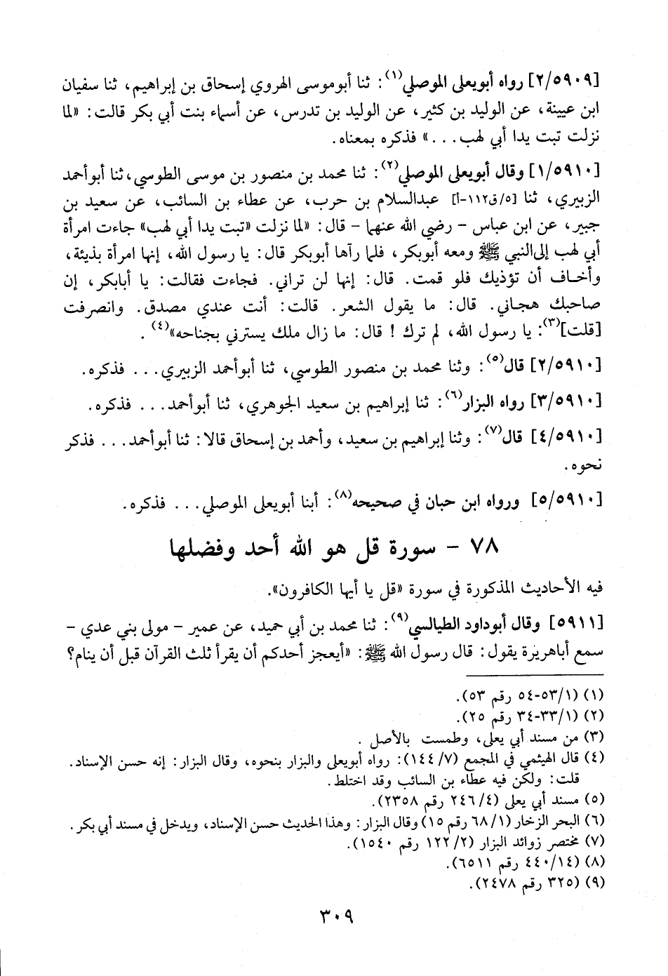 5909 / 2 - رَوَاهُ أَبُو يَعْلَى الْمَوْصِلِيُّ: ثَنَا أَبُو مُوسَى الْهَرَوِيُّ إِسْحَاقُ بْنُ إِبْرَاهِيمَ، ثَنَا سُفْيَانُ بْنُ عُيَيْنَةَ، عَنِ الْوَلِيدِ بْنِ كَثِيرٍ، عَنِ الْوَلِيدُ بْنِ تَدْرُسَ، عَنْ أَسْمَاءَ بِنْتِ أَبِي بَكْرٍ قَالَتْ: "لَمَّا نَزَلَتْ تَبَّتْ يَدَا أَبِي لَهَبٍ ... " فَذَكَرَهُ بِمَعْنَاهُ.