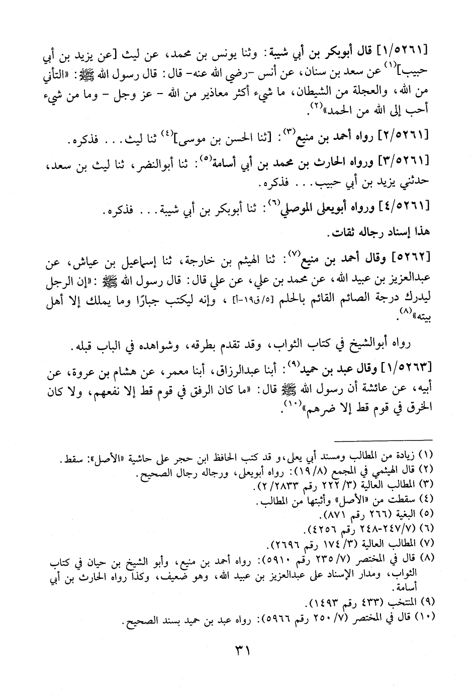 5261 / 1 - قَالَ أَبُو بَكْرِ بْنُ أَبِي شَيْبَةَ: وَثَنَا يونس بن محمد، عن لَيْثٌ عَنْ يَزِيدَ بْنِ أَبِي حَبِيبٍ، عَنْ سَعْدٍ بْنِ سِنَانٍ، عَنْ أَنَسٍ- رَضِيَ اللَّهُ عَنْهُ- قَالَ: قَالَ رَسُولُ اللَّهِ - صَلَّى اللَّهُ عَلَيْهِ وَسَلَّمَ -: "التَّأَنِّي مِنَ اللَّهِ، وَالْعَجَلَةُ مِنَ الشَّيْطَانِ، مَا شَيْءٌ أَكْثَرُ مَعَاذِيرَ مِنَ اللَّهِ- عَزَّ وَجَلَّ- وَمَا مِنْ شَيْءٍ أَحَبُّ إِلَى اللَّهِ مِنَ الْحَمْدِ".