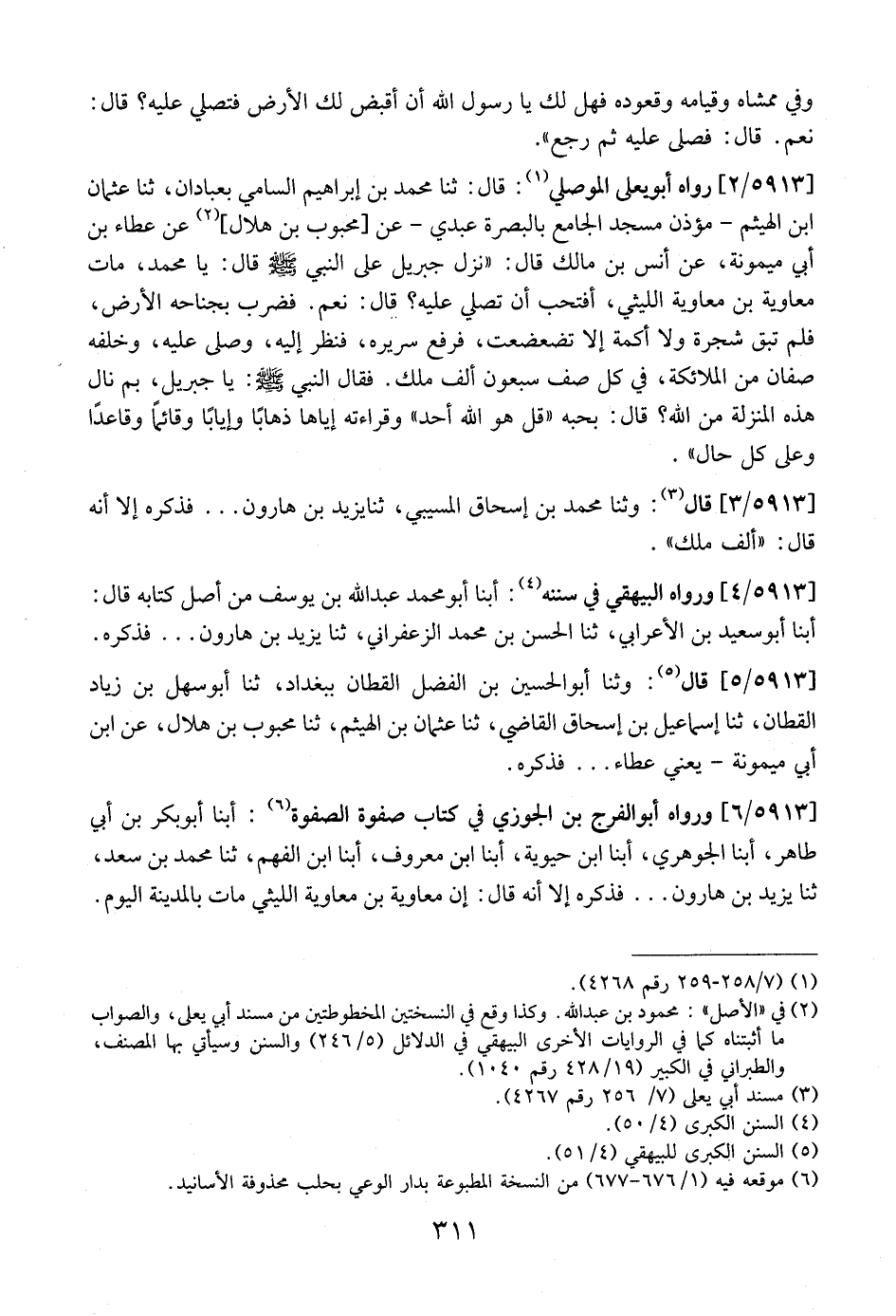 5913 / 2 - رَوَاهُ أَبُو يَعْلَى الْمُوصِلِيُّ: قَالَ: ثَنَا مُحَمَّدُ بْنُ إِبْرَاهِيمَ السَّامِيُّ بِعَبَادَانَ، ثَنَا عُثْمَانُ بْنُ الْهَيْثَمِ- مُؤَذِّنُ مَسْجِدِ الجامع بالبصرة عبدي- عن محبوب بن هلال، عَنْ عَطَاءِ بْنِ أَبِي مَيْمُونَةَ، عَنْ أَنَسٍ بْنِ مَالِكٍ قَالَ: "نَزَلَ جِبْرِيلُ عَلَى النَّبِيَّ - صَلَّى اللَّهُ عَلَيْهِ وَسَلَّمَ - قَالَ: يَا مُحَمَّدُ، مَاتَ مُعَاوِيَةُ بْنُ مَعَاوِيَةَ اللَّيْثِيُّ، أَفَتُحِبُّ أَنْ تُصَلِّيَ عَلَيْهِ؟ قَالَ: نَعَمْ. فَضَرَبَ بِجَنَاحِهِ الْأَرْضَ، فَلَمْ تَبْقَ شَجَرَةٌ وَلَا أَكْمَةٌ إِلَّا تَضَعْضَعَتْ، فَرَفَعَ سَرِيرَهُ، فَنَظَرَ إِلَيْهِ، وَصَلَّى عَلَيْهِ، وَخَلْفَهُ صفان من الملائكة، في كل صف لسبعون أَلْفَ مَلَكٍ. فَقَالَ النَّبِيُّ صَلَّى اللَّهُ عَلَيْهِ وَسَلَّمَ: يَا جبريل، بم نَالَ هَذِهِ الْمَنْزِلَةَ مِنَ اللَّهِ؟ قَالَ: بِحُبِّهِ "قُلْ هُوَ اللَّهُ أَحَدٌ" وَقِرَاءَتِهِ إِيَّاهَا ذَهَابًا وإياباً وقائماً وقاعداً وعلى كُلِّ حَالٍ".