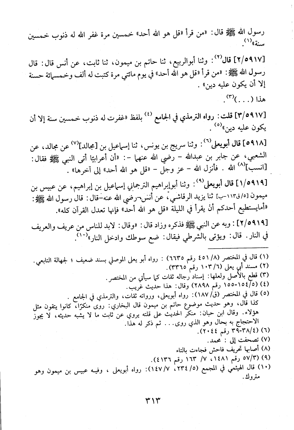 5919 / 1 - قَالَ أَبُو يَعْلَى: وَثنا أَبُو إِبْرَاهِيمَ التُّرْجُمَانِيُّ إِسْمَاعِيلُ بْنُ إِبْرَاهِيمَ، عَنْ عُبَيْسُ بْنُ مَيْمُونٍ ثَنَا يَزِيدُ الرَّقَاشِيُّ، عَنْ أَنَسٍ رَضِيَ اللَّهُ عَنْهُ- قَالَ: قَالَ رَسُولُ اللَّهِ - صَلَّى اللَّهُ عَلَيْهِ وَسَلَّمَ -: "أَمَا يَسْتَطِيعُ أَحَدُكُمْ أَنْ يَقْرَأَ فِي اللَّيْلَةِ "قُلْ هُوَ اللَّهُ أَحَدٌ" فَإِنَّهَا تَعْدِلُ الْقُرْآنَ كُلَّهُ".