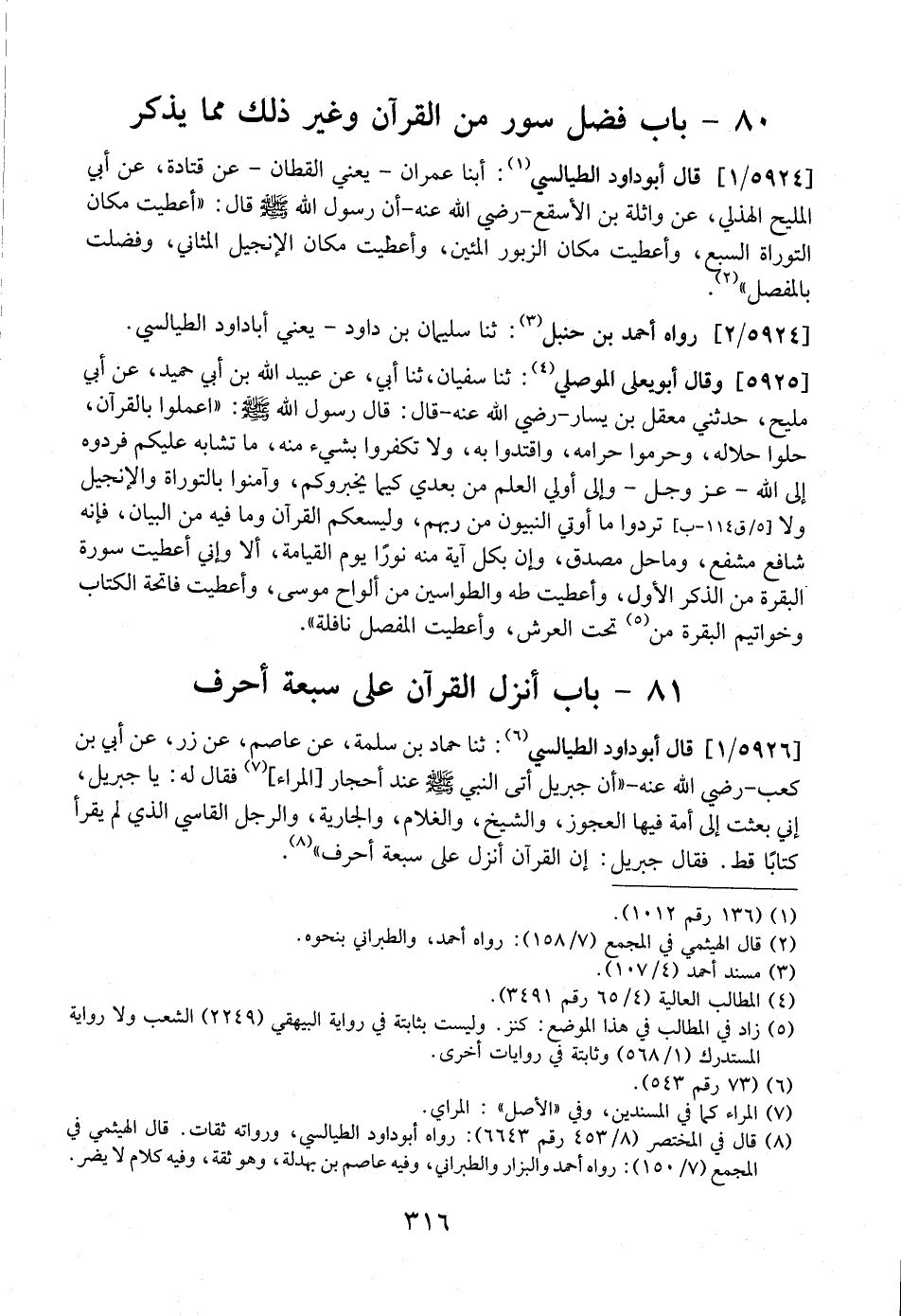 5926 / 1 - قَالَ أَبُو دَاوُدَ الطَّيَالِسِيُّ: ثَنَا حَمَّادُ بْنُ سلمة، عن عاصم، عَنْ زِرٍّ، عَنْ أُبَيِّ بْنِ كَعْبٍ- رَضِيَ اللَّهُ عَنْهُ- "أَنَّ جِبْرِيلَ أَتَى النَّبِيَّ - صَلَّى اللَّهُ عَلَيْهِ وَسَلَّمَ - عِنْدَ أَحْجَارِ المراء، فَقَالَ لَهُ: يَا جِبْرِيلُ، إِنِّي بُعِثْتُ إِلَى أُمَّةٍ فِيهَا الْعَجُوزُ، وَالشَّيْخُ، وَالْغُلَامُ، وَالْجَارِيَةُ، وَالرَّجُلُ الْقَاسِي الَّذِي لَمْ يَقْرَأْ كِتَابًا قَطُّ. فَقَالَ جِبْرِيلُ: إِنَّ الْقُرْآنَ أُنْزِلَ عَلَى سَبْعَةِ أَحْرُفٍ".