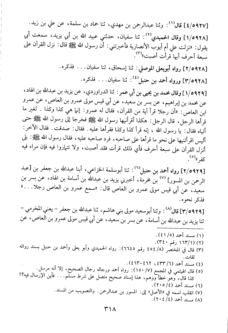 5929 / 1 - وَقَالَ مُحَمَّدُ بْنُ يَحْيَى بْنِ أَبِي عُمَرَ: ثَنَا الدَّرَاوَرْدِيُّ، عَنْ يَزِيدَ بْنِ عَبْدِ اللَّهِ بْنِ الْهَادِ، عَنْ مُحَمَّدِ بْنِ إِبْرَاهِيمَ، عَنْ بُسْرِ بْنِ سَعِيدٍ، عَنْ أَبِي قَيْسٍ مَوْلَى عَمْرِو بْنِ الْعَاصِ، عَنْ عَمْرِو بْنِ الْعَاصِ: "أَنَّ رَجُلًا قَرَأَ آيَةً مِنَ الْقُرْآنِ، فَقَالَ لَهُ عَمْرٌو: إِنَّمَا هِيَ كَذَا وَكَذَا. لِغَيْرِ مَا قَرَأَهَا الرَّجُلُ، قَالَ الرَّجُلُ: هَكَذَا أَقْرَأَنِيهَا رَسُولُ اللَّهِ - صَلَّى اللَّهُ عَلَيْهِ وَسَلَّمَ - فَخَرَجَا إِلَى رَسُولِ اللَّهِ - صَلَّى اللَّهُ عَلَيْهِ وَسَلَّمَ - حَتَّى أَتَيَاهُ فَقَالَ: يَا رَسُولَ اللَّهِ، إِنَّهُ قَرَأَ كَذَا وَكَذَا فَقَرَأَهَا عَلَيْهِ. فَقَالَ: صَدَقْتَ. فَقَالَ الْآخَرُ: أَلْيَسَ أَقْرَأْتِنِيهَا عَلَى نَحْوِ مَا قَرَأَهَا عَلَى صَاحِبِهِ، فَرَدَّ صَاحِبُهُ عَلَيْهِ، فَقَالَ رَسُولُ اللَّهِ - صَلَّى اللَّهُ عَلَيْهِ وَسَلَّمَ -: بَلَى أُنْزِلَ الْقُرْآنُ عَلَى سَبْعَةِ أَحْرُفٍ فأي ذلك قرأت فقد أصبت، فلا تتماروا فِيهِ فِإِنَّ مِرَاءً فِيهِ كُفْرٌ".