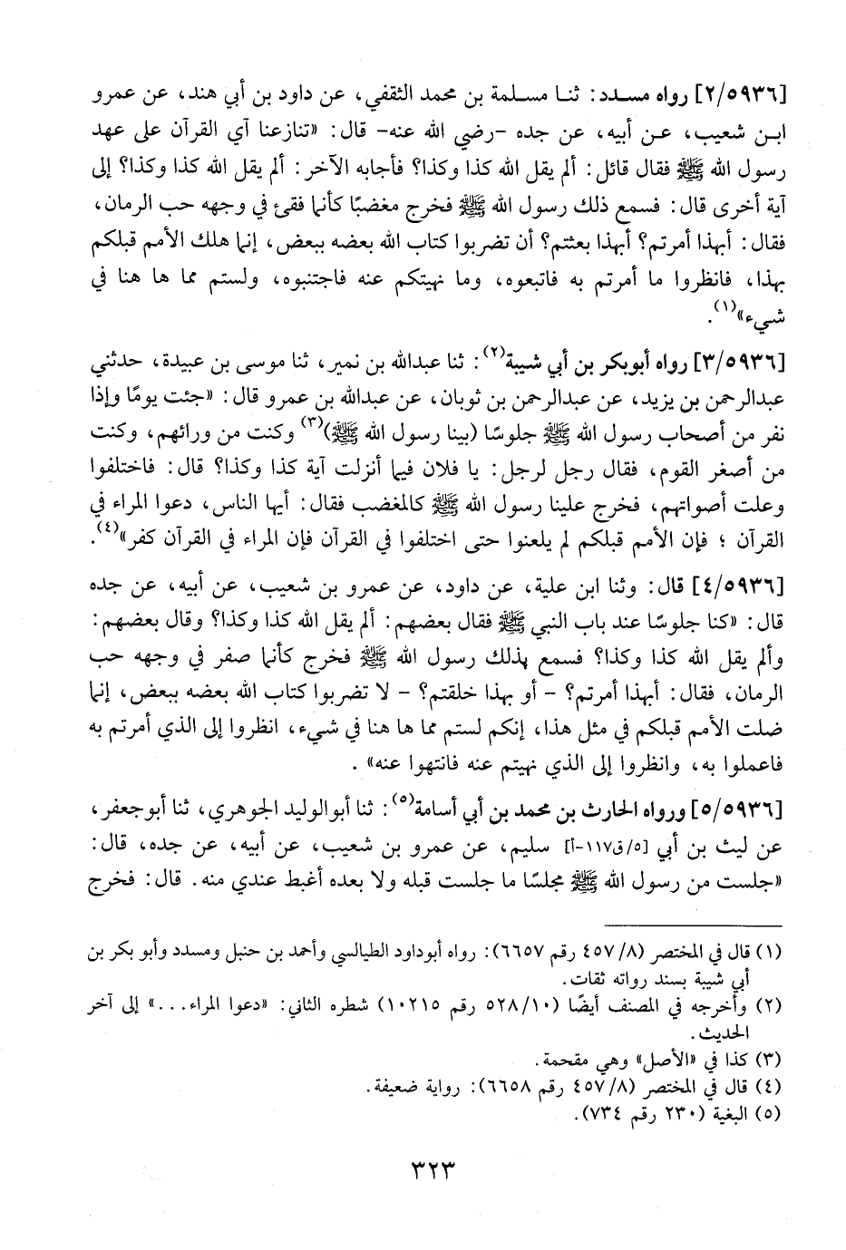 5936 / 2 - رَوَاهُ مُسَدَّدٌ: ثَنَا مَسْلَمَةُ بْنُ مُحَمَّدٍ الثَّقَفِيُّ، عَنْ دَاوُدَ بْنِ أَبِي هِنْدٍ، عَنْ عَمْرِو بْنِ شُعَيْبٍ، عَنْ أَبِيهِ، عَنْ جَدِّهِ- رَضِيَ اللَّهُ عَنْهُ- قَالَ: "تَنَازَعْنَا آيَ الْقُرْآنَ عَلَى عَهْدِ رَسُولِ اللَّهِ - صَلَّى اللَّهُ عَلَيْهِ وَسَلَّمَ - فَقَالَ قَائِلٌ: أَلَمْ يَقُلِ اللَّهُ كَذَا وَكَذَا؟ فَأَجَابَهُ الْآخَرُ: أَلَمْ يَقُلِ اللَّهُ كَذَا وَكَذَا؟ إِلَى آيَةٍ أُخْرَى قَالَ: فَسَمِعَ ذَلِكَ رَسُولَ اللَّهِ - صَلَّى اللَّهُ عَلَيْهِ وَسَلَّمَ - فَخَرَجَ مُغْضَبًا كَأَنَّمَا فُقِئَ فِي وَجْهِهِ حَبُّ الرُّمَّانِ، فَقَالَ: أَبِهَذَا أُمِرْتُمْ؟ أبهذا بُعِثْتُمْ أَنْ تَضْرِبُوا كِتَابَ اللَّهِ بَعْضَهُ بِبَعْضٍ، إنما هلك الأمم قبهلكم بِهَذَا، فَانْظُرُوا مَا أُمِرْتُمْ بِهِ فَاتَّبِعُوهُ، وَمَا نهيتكم عنه فاجتنبوه، ولستم مما ها هنا فِي شَيْءٍ".
