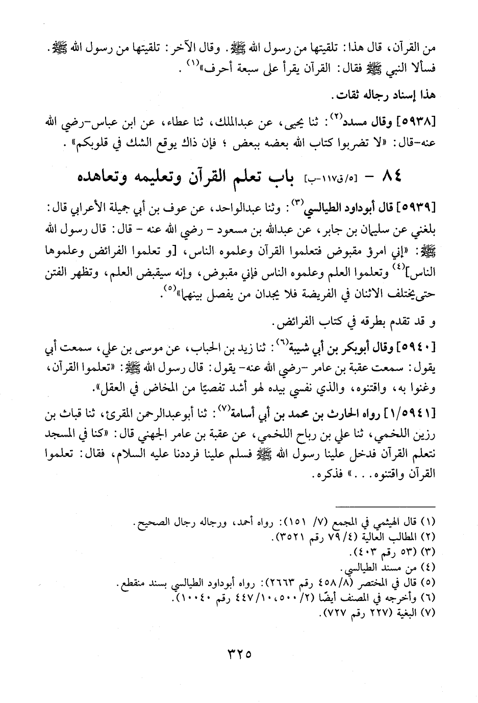 5941 / 1 - رَوَاهُ الْحَارِثُ بْنُ مُحَمَّدِ بْنِ أَبِي أُسَامَةَ: ثنا أبو عبد الرحمن المقرئ، ثنا قباث بن رزين اللخمي، ثَنَا عَلِيُّ بْنُ رَبَاحٍ اللَّخْمِيُّ، عَنْ عُقْبَةَ بْنِ عَامِرٍ الْجُهَنِيِّ قَالَ: "كُنَّا فِي الْمَسْجِدِ نتعلم القرآن فدخل عَلَيْنَا رَسُولُ اللَّهِ - صَلَّى اللَّهُ عَلَيْهِ وَسَلَّمَ - فسلم علينا فرددنا عليه السلام، فقال: تعلموا القرآن واقتنوه ... " فذكره.