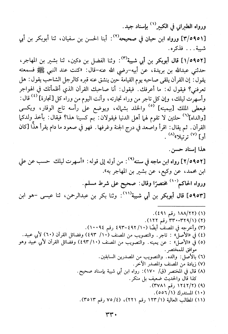 5952 / 1 - قَالَ أَبُو بَكْرِ بْنُ أَبِي شَيْبَةَ: وَثَنَا الْفَضْلُ بْنُ دُكَيْنٍ، ثَنَا بَشِيرُ بْنُ الْمُهَاجِرِ، حَدَّثَنِي عَبْدُ اللَّهِ بْنُ بُرَيْدَةَ، عَنْ أَبِيهِ- رَضِيَ اللَّهُ عَنْهُ- قَالَ: "كُنْتُ عِنْدَ النَّبِيِّ - صَلَّى اللَّهُ عَلَيْهِ وَسَلَّمَ - فَسَمِعْتُهُ يَقُولُ: إِنَّ الْقُرْآنَ يَلْقَى صَاحِبَهُ يَوْمَ الْقِيَامَةِ حِينَ يَنْشَقُّ عَنْهُ قَبْرُهُ كَالرَّجُلِ الشَّاحِبِ يَقُولُ: هَلْ تَعْرِفُنِي؟ فَيَقُولُ لَهُ: مَا أَعْرِفُكَ. فَيَقُولُ: أَنَا صَاحِبُكَ الْقُرْآنُ الَّذِي أَظْمَأْتُكَ فِي الْهَوَاجِرِ وَأَسْهَرْتُ لَيْلَكَ، وَإِنَّ كُلَّ تَاجِرٍ مِنْ وَرَاءِ تِجَارَتِهِ، وَأَنْتَ الْيَوْمَ مِنْ وَرَاءِ كُلِّ تجارة، قال: فيعطى الملك بيمينه-، وَالْخُلْدَ بِشِمَالِهِ، وَيُوضَعُ عَلَى رَأْسِهِ تَاجُ الْوَقَارِ، ويكسى والداه حلتين لا تقوم لهما أهل الدنيا فيقولان: بم كُسِينَا هَذَا؟ فَيُقَالُ: بِأَخْذِ وَلَدِكُمَا الْقُرْآنَ. ثُمَّ يُقَالُ: اقْرَأْ وَاصْعَدْ فِي دَرَجِ الْجَنَّةَ وَغُرَفِهَا. فَهُوَ فِي صُعُودٍ مَا دَامَ يَقْرَأُ هَذًّا كان أو ترتيلاً".