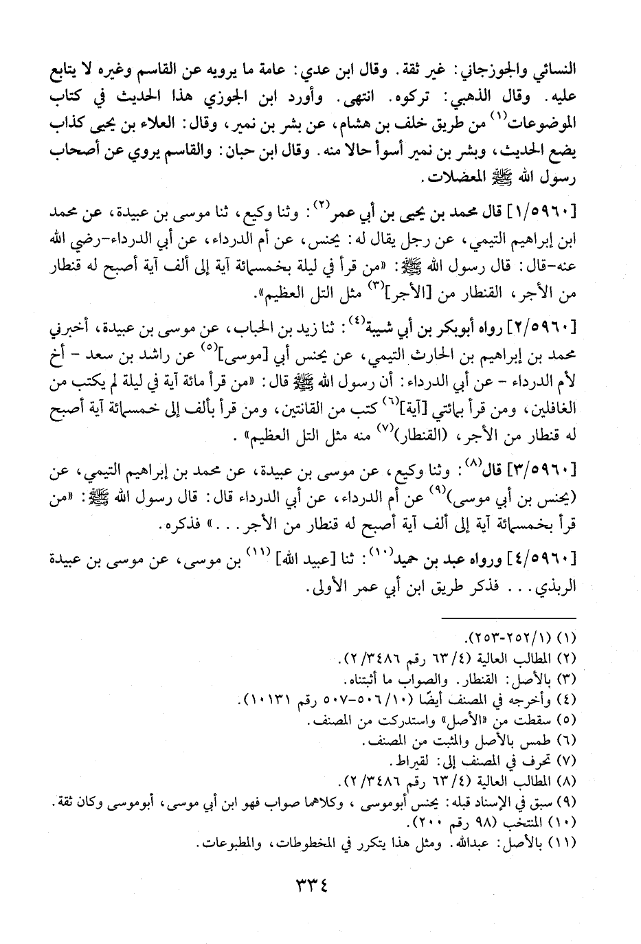 5960 / 2 - رَوَاهُ أَبُو بَكْرِ بْنُ أَبِي شَيْبَةَ: ثَنَا زَيْدُ بْنُ الْحُبَابِ، عَنْ مُوسَى بْنِ عُبَيْدَةَ، أَخْبَرَنِي مُحَمَّدُ بْنُ إِبْرَاهِيمَ بْنِ الْحَارِثِ التَّيْمِيُّ، عن يحنس أبي موسى عَنْ رَاشِدِ بْنِ سَعْدٍ- أَخٍ لِأُمِّ الدَّرْدَاءِ- عن أبي الدرداء: أن رسول الله - صلى اللَّهُ عَلَيْهِ وَسَلَّمَ - قَالَ: "مَنْ قَرَأَ مِائَةَ آيَةٍ فِي لَيْلَةٍ لَمْ يُكْتَبْ مِنَ الْغَافِلِينَ، وَمَنْ قَرَأَ بِمِائَتَيْ آيَةٍ كُتِبَ مِنَ الْقَانِتِينَ، ومن قرأ بألف إلى خمسمائة آيَةٍ أَصْبَحَ لَهُ قِنْطَارٌ مِنَ الْأَجْرِ، الْقِنْطَارُ مِنْهُ مِثْلُ التَّلِّ الْعَظِيمِ".