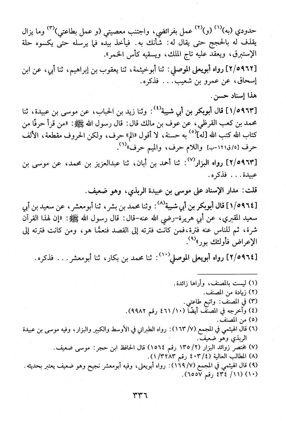 5963 / 1 - قَالَ أَبُو بَكْرِ بْنُ أَبِي شَيْبَةَ: وَثَنَا زَيْدُ بْنُ الْحُبَابِ، عَنْ مُوسَى بْنِ عُبَيْدَةَ، ثَنَا مُحَمَّدُ بْنُ كَعْبٍ الْقَرَظِيُّ، عَنْ عَوْفِ بْنِ مَالِكٍ قَالَ: قَالَ رَسُولُ اللَّهِ - صَلَّى اللَّهُ عَلَيْهِ وَسَلَّمَ -: "مَنْ قَرَأَ حَرْفًا مِنْ كِتَابِ اللَّهِ كَتَبَ اللَّهُ له بِهِ حَسَنَةً، لَا أَقُولُ "الم " حَرْفٌ، وَلَكِنِ الْحُرُوفُ مُقَطَّعَةٌ، الْأَلِفُ حَرْفٌ وَاللَّامُ حَرْفٌ، وَالْمِيمُ حَرْفٌ".