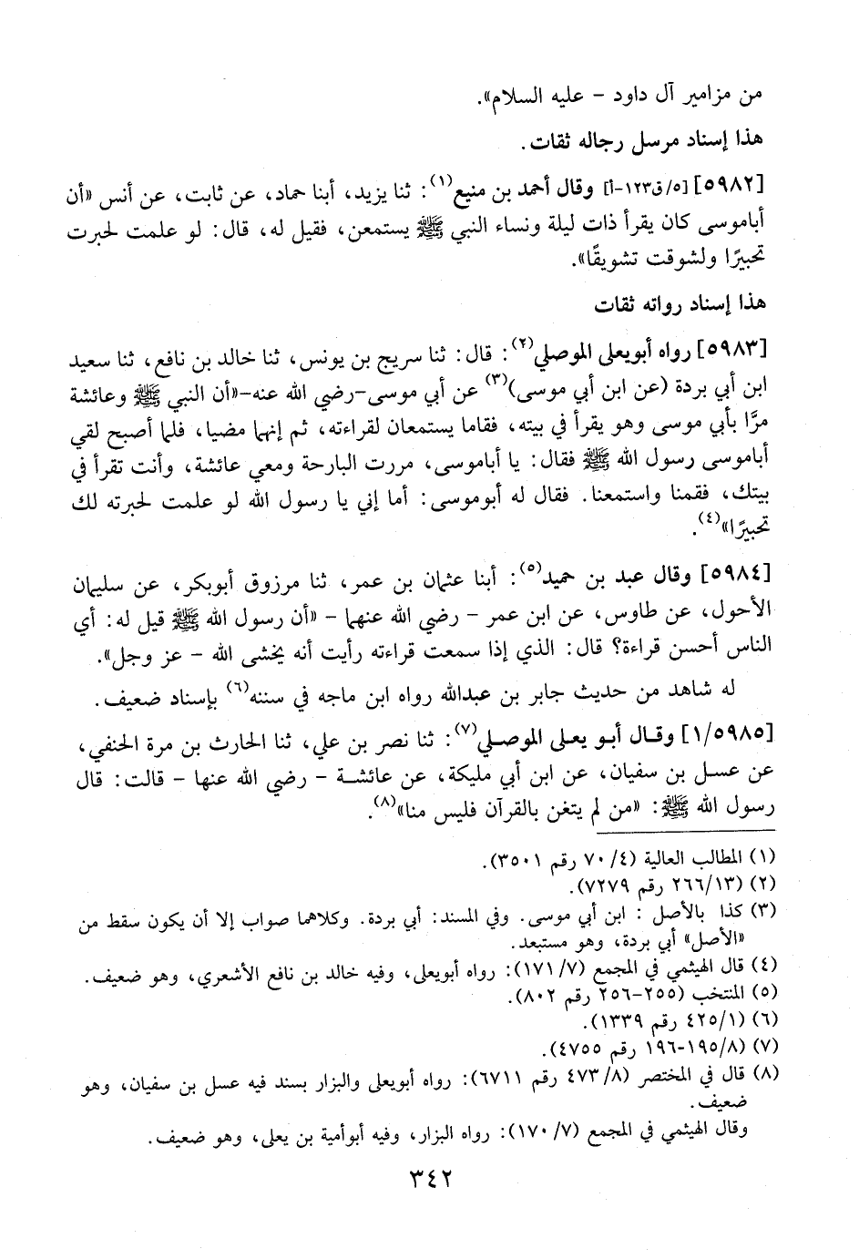 5983 - رَوَاهُ أَبُو يَعْلَى الْمُوصِلِيُّ: قَالَ: ثَنَا سُرَيْجُ بْنُ يُونُسَ، ثَنَا خالد بن نافع، ثنا سعيد ابن أَبِي بُرْدَةَ عَنِ ابْنِ أَبِي مُوسَى عَنْ أَبِي مُوسَى- رَضِيَ اللَّهُ عَنْهُ- "أَنّ النَّبِيَّ - صَلَّى اللَّهُ عَلَيْهِ وَسَلَّمَ - وَعَائِشَةَ مرَّا بِأَبِي مُوسَى وَهُوَ يَقْرَأُ فِي بَيْتِهِ، فَقَامَا يَسْتَمِعَانِ لِقِرَاءَتِهِ، ثُمَّ إِنَّهُمَا مَضَيَا، فَلَمَّا أَصْبَحَ لَقِيَ أَبَا مُوسَى رَسُولُ اللَّهِ - صَلَّى اللَّهُ عَلَيْهِ وَسَلَّمَ - فَقَالَ: يَا أَبَا مُوسَى، مَرَرْتُ الْبَارِحَةَ وَمَعِي عَائِشَةُ، وَأَنْتَ تَقْرَأُ فِي بَيْتِكَ، فَقُمْنَا وَاسْتَمَعْنَا. فَقَالَ لَهُ أَبُو مُوسَى: أَمَا إِنِّي يَا رَسُولُ اللَّهِ لَوْ عَلِمْتُ لَحَبَّرْتُهُ لَكَ تحبيراً".