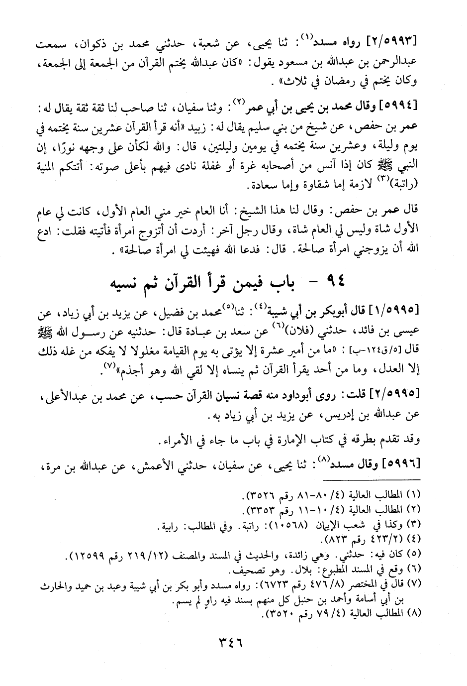 5994 - وَقَالَ مُحَمَّدُ بْنُ يَحْيَى بْنِ أَبِي عُمَرَ: وَثَنَا سفيان، ثنا صاحب لنا ثقة ثِقَةٌ يُقَالُ لَهُ: عُمَرُ بْنُ حَفْصٍ، عَنْ شَيْخٍ مِنْ بَنِي سُلَيْمٍ يُقَالُ لَهُ: زُبَيْدٌ "أَنَّهُ قَرَأَ الْقُرْآنَ عِشْرِينَ سَنَةً يَخْتِمُهُ فِي يَوْمٍ وَلَيْلَةٍ، وَعِشْرِينَ سَنَةً يَخْتِمُهُ فِي يَوْمَيْنِ وَلَيْلَتَيْنِ، قَالَ: وَاللَّهِ لَكَأَنَّ عَلَى وَجْهِهِ نُورًا، أَنّ النَّبِيَّ - صَلَّى اللَّهُ عَلَيْهِ وَسَلَّمَ - كَانَ إِذَا أَنِسَ مِنْ أَصْحَابِهِ غِرَّةً أَوْ غَفْلَةً نادى فيهم بأعلى صوته: أتتكم المنية راتبة لازمة إما شقاوة وَإِمَّا سَعَادَةٌ.