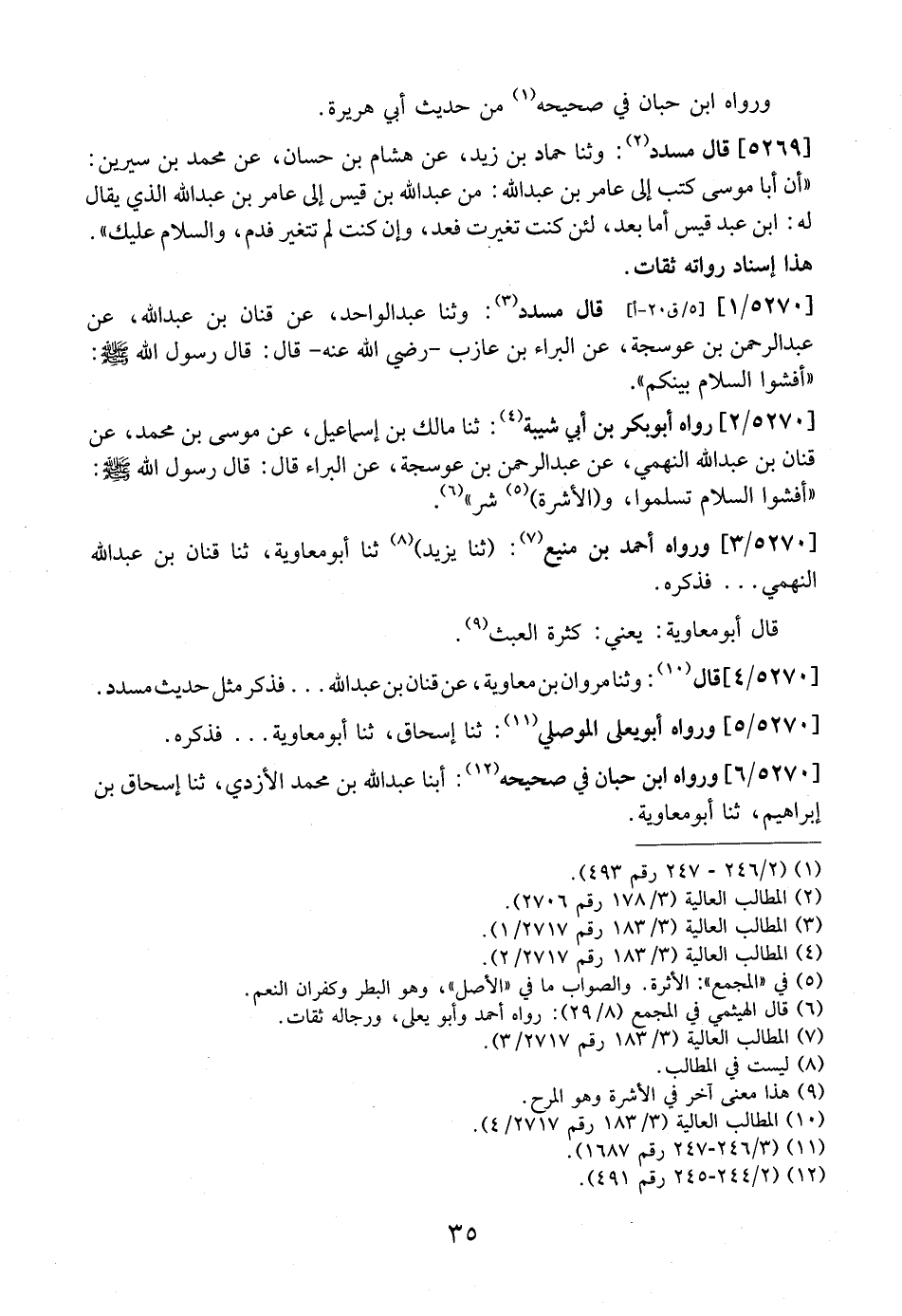 5270 / 1 - قَالَ مُسَدَّدٌ: وَثَنَا عَبْدُ الْوَاحِدِ، عَنْ قَنَانِ بْنِ عَبْدِ اللَّهِ، عَنْ عَبْدِ الرَّحْمَنِ بْنِ عَوْسَجَةَ، عَنِ الْبَرَاءِ بْنِ عَازِبٍ- رَضِيَ اللَّهُ عَنْهُ- قَالَ: قَالَ رَسُولُ اللَّهِ صَلَّى اللَّهُ عَلَيْهِ وَسَلَّمَ: "أَفْشُوا السَّلَامَ بَيْنَكُمْ".