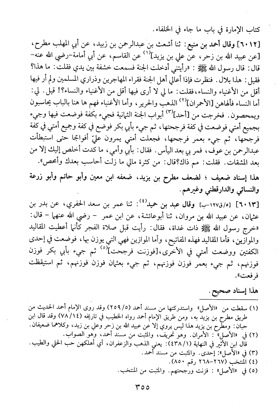 6012 - وَقَالَ أَحْمَدُ بْنُ مَنِيعٍ: ثَنَا أَشْعَثُ بْنُ عَبْدِ الرَّحْمَنِ بْنِ زُبَيْدٍ، عَنْ أَبِي المهلب مطرح، عَنْ عُبَيْدِ اللَّهِ بْنِ زُحَرَ، عَنْ عَلِيِّ بْنِ يَزِيدَ، عَنِ الْقَاسِمِ، عَنْ أَبِي أُمَامَةَ- رَضِيَ اللَّهُ عَنْهُ- قَالَ: قَالَ رَسُولُ اللَّهِ - صَلَّى اللَّهُ عَلَيْهِ وسلم -: "رأيتني أدخلت الجنة فسمعت خشفة بَيْنَ يَدَيَّ فَقُلْتُ: مَا هَذَا فَقِيلَ: هَذَا بلال. فنظرت فإذا أعالي أهل الجنة فقراء الْمُهَاجِرِينَ وَذَرَارِي الْمُسْلِمِينَ وَلَمْ أَرَ فِيهَا أَقَلَّ من الأغنياء والنساء، فقلت: ما لي لا أَرَى فِيهَا أَقَلَّ مِنَ الْأَغْنِيَاءِ وَالنِّسَاءِ؟! قِيلَ. لِي: أَمَّا النِّسَاءُ فَأَلْهَاهُنَّ الْأَحْمَرَانِ الذَّهَبُ وَالْحَرِيرُ، وأما الأغنياء فهم ها هنا بالباب يحاسبون ويمحصون. فخرجت من أحد أَبْوَابِ الْجَنَّةِ الثَّمَانِيَةِ فَجِيءَ بِكِفَّةٍ فَوُضِعْتُ فِيهَا وَجِيءَ بِجَمِيعِ أُمَّتِي فَوُضِعَتْ فِي كِفَّةٍ فَرَجَحْتُهَا، ثُمَّ جِيءَ بِأَبِي بَكْرٍ فَوُضِعَ فِي كِفَّةٍ وَجَمِيعُ أُمَّتِي فِي كِفَّةٍ فَرَجَحَهَا، ثُمَّ جِيءَ بِعُمَرَ فَرَجَحَهَا، فَجَعَلَتْ أُمَّتِي يَمُرُّونَ عَلَيَّ أَفْوَاجًا حَتَّى اسْتَبْطَأْتُ عَبْدَ الرَّحْمَنِ بْنَ عَوْفٍ، فَمَرَّ بِي بَعْدَ الْيَأْسِ. فَقَالَ: بِأَبِي وَأُمِّي، مَا كدت أخلص إليك إلا من بعد المشقات. فقلت: مم ذاك؟ قَالَ: مِنْ كَثْرَةِ مَالِي مَا زِلْتُ أُحَاسَبُ بَعْدَكَ وَأُمَحَّصُ". هَذَا إِسْنَادٌ ضَعِيفٌ؟ لِضَعْفِ مُطَرَّحِ بْنِ يَزِيدَ، ضَعَّفَهُ ابْنُ مَعِينٍ وَأَبُو حَاتِمٍ وَأَبُو زُرْعَةَ وَالنَّسَائِيُّ وَالدَّارَقُطْنِيُّ وَغَيْرُهُمْ.