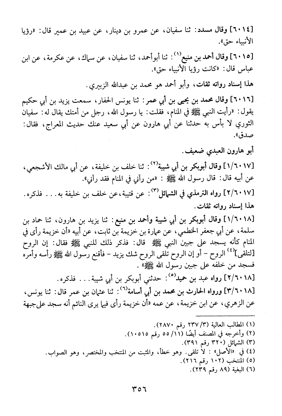 6018 / 1 - وَقَالَ أَبُو بَكْرِ بْنُ أَبِي شَيْبَةَ وَأَحْمَدُ بْنُ مَنِيعٍ: ثَنَا يَزِيدُ بْنُ هَارُونَ، ثَنَا حَمَّادُ بْنُ سَلَمَةَ، عَنْ أَبِي جَعْفَرٍ الْخَطْمِيِّ، عَنْ عُمَارَةَ بْنِ خُزَيْمَةَ بْنِ ثَابِتٍ، عَنْ أَبِيهِ "أَنَّ خُزَيْمَةَ رَأَى فِي الْمَنَامِ كَأَنَّهُ يَسْجُدُ عَلَى جَبِينِ النَّبِيِّ - صَلَّى اللَّهُ عَلَيْهِ وَسَلَّمَ - قَالَ: فَذَكَرَ ذَلِكَ لِلنَّبِيِّ - صَلَّى اللَّهُ عَلَيْهِ وَسَلَّمَ - فَقَالَ: إن الروح لتلقى الرَّوْحَ- أَوْ إِنَّ الرَّوْحَ تَلْقَى الرَّوْحَ شَكَّ يزيد- فأقنع رَسُولُ اللَّهِ - صَلَّى اللَّهُ عَلَيْهِ وَسَلَّمَ - رَأْسَهُ وَأَمَرَهُ فَسَجَدَ مِنْ خَلْفِهِ عَلَى جَبِينِ رَسُولِ اللَّهِ - صَلَّى اللَّهُ عَلَيْهِ وَسَلَّمَ -.