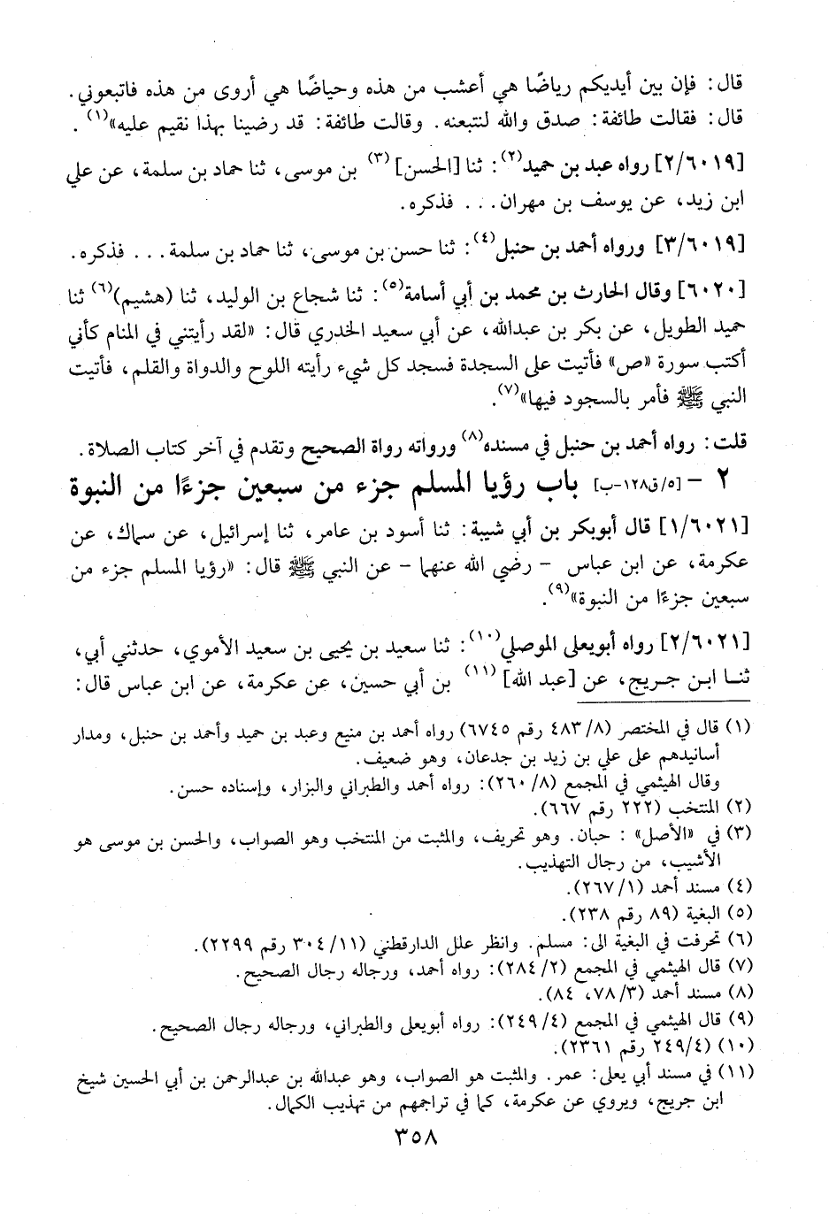 6021 / 1 - قَالَ أَبُو بَكْرِ بْنُ أَبِي شَيْبَةَ: ثَنَا أَسْوَدُ بْنُ عَامِرٍ، ثَنَا إِسْرَائِيلُ، عَنْ سِمَاكٍ، عَنْ عِكْرِمَةَ، عَنِ ابْنِ عَبَّاسٍ- رَضِيَ اللَّهُ عَنْهُمَا- عَنِ النَّبِيِّ - صَلَّى اللَّهُ عَلَيْهِ وَسَلَّمَ - قَالَ: "رُؤْيَا الْمُسْلِمِ جُزْءٌ مِنْ سَبْعِينَ جُزْءًا مِنَ النُّبُوَّةِ".