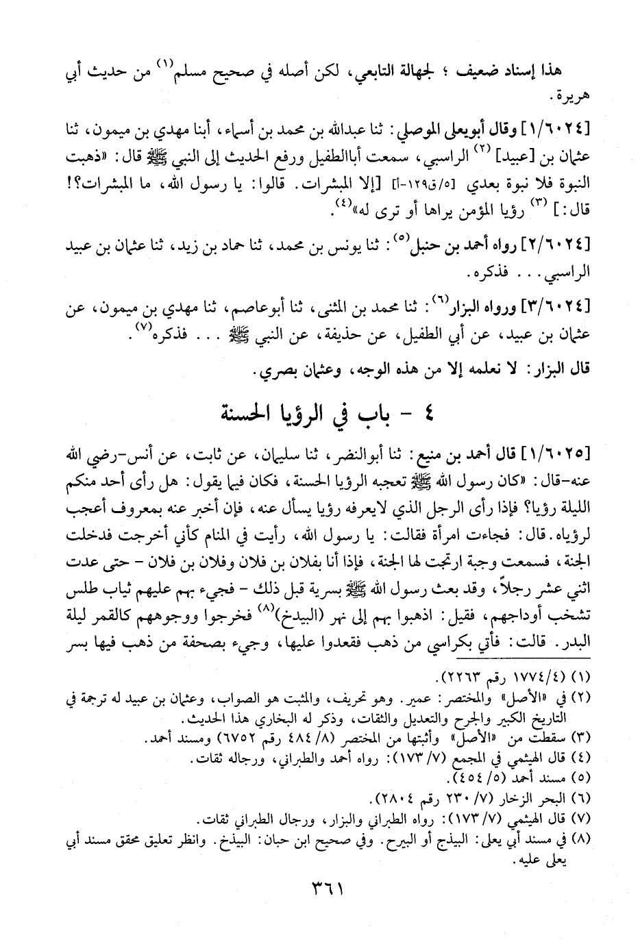 6024 / 1 - وَقَالَ أَبُو يَعْلَى الْمَوْصِلِيُّ: ثَنَا عَبْدُ اللَّهِ بن محمد بن أسماء، أبنا مهدي بن ميمون، ثنا عثمان بن عبيد، الراسبي، سَمِعْتُ أَبَا الطُّفَيْلِ وَرَفَعَ الْحَدِيثَ إِلَى النَّبِيِّ - صَلَّى اللَّهُ عَلَيْهِ وَسَلَّمَ - قَالَ: "ذَهَبَتِ النُّبُوَّةُ فلا نبوة بعدي إلا المبشرات. قالوا: يا رسول الله، ما المبشرات؟! قال: رؤيا المؤمن يراها أو ترى له".