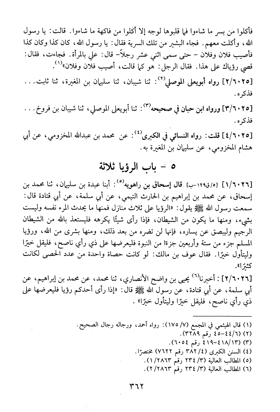 6026 / 1 - قَالَ إِسْحَاقُ بْنُ راهويه: أبنا عبدة بْنُ سُلَيْمَانَ، ثنا مُحَمَّدُ بْنُ إِسْحَاقَ، عَنْ مُحَمَّدُ بْنُ إِبْرَاهِيمَ بْنِ الْحَارِثِ التَّيْمِيُّ، عَنْ أَبِي سَلَمَةَ، عَنْ أَبِي قَتَادَةَ قَالَ: سَمِعْتُ رَسُولَ اللَّهِ - صَلَّى اللَّهُ عَلَيْهِ وَسَلَّمَ - يَقُولُ: "الرُّؤْيَا عَلَى ثَلَاثِ مَنَازِلَ فَمِنْهَا مَا يُحَدَّثُ الْمَرْءُ نَفْسَهُ وَلَيْسَتْ بِشَيْءٍ، وَمِنْهَا مَا يَكُونُ مِنَ الشَّيْطَانُ، فَإِذَا رَأَى شَيْئًا يَكْرَهُهُ فَلْيَسْتَعِذْ بِاللَّهِ مِنَ الشَّيْطَانِ الرَّجِيمِ وَلْيَبْصُقْ عَنْ يَسَارِهِ، فَإِنَّهَا لَنْ تَضُرَّهُ مِنْ بَعْدِ ذَلِكَ، وَمِنْهَا بُشْرَى مِنَ اللَّهِ، وَرُؤْيَا الْمُسْلِمِ جُزْءٌ مِنْ سِتَّةٍ وَأَرْبَعِينَ جُزْءًا مِنَ النُّبُوَّةِ فَلْيَعْرِضْهَا عَلَى ذِي رَأْيٍ ناصح، فليقل خيراً وليتأول خَيْرًا. فَقَالَ عَوْفُ بْنُ مَالِكٍ: لَوْ كَانَتْ حصاة واحدة من عدد الحصى لكانت كَثِيرًا".