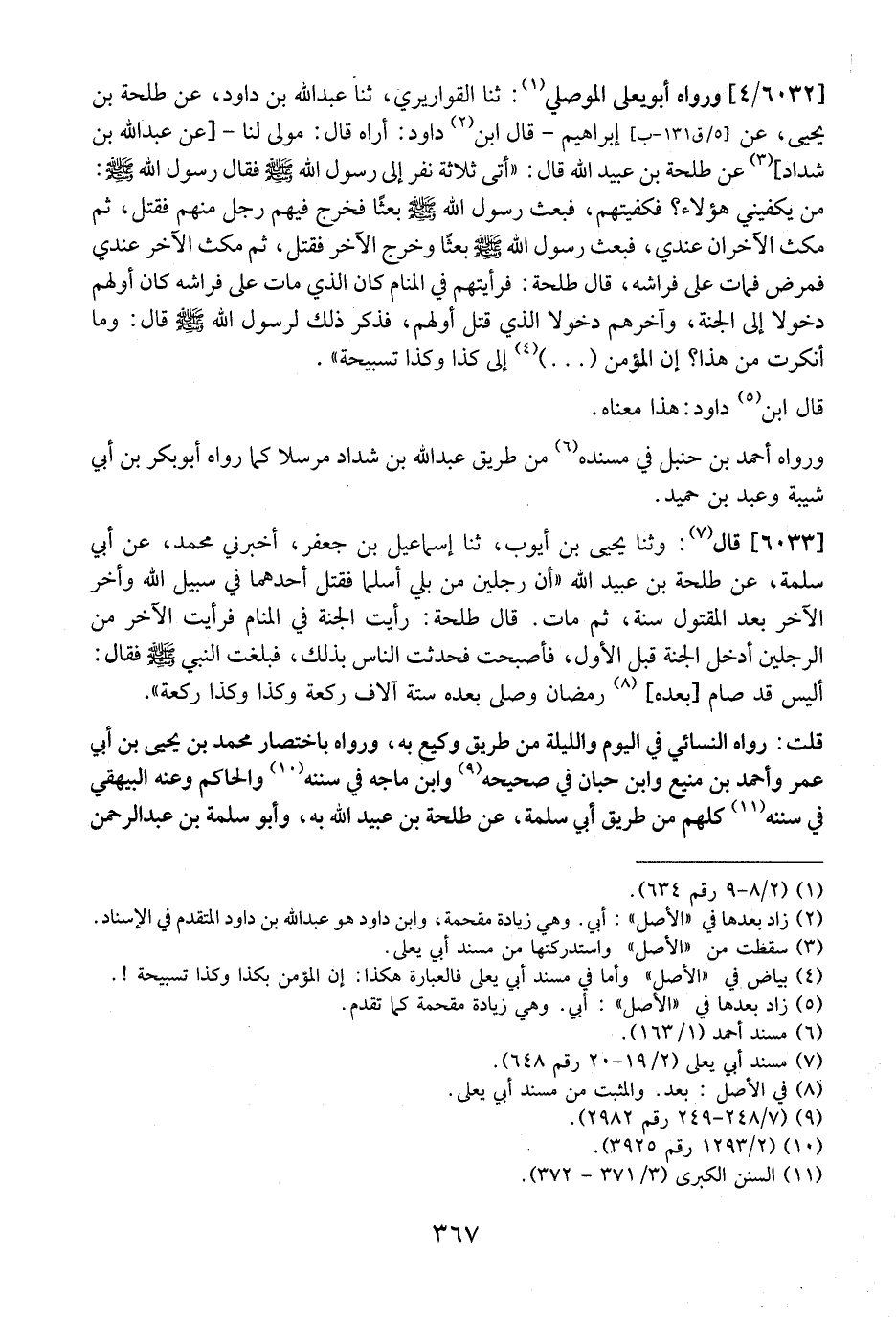 6032 / 4 - وَرَوَاهُ أَبُو يَعْلَى الْمَوْصِلِيُّ: ثَنَا الْقَوَارِيرِيُّ، ثَنَا عَبْدُ اللَّهِ بْنُ دَاوُدَ، عَنْ طَلْحَةَ بْنِ يَحْيَى، عَنْ إِبْرَاهِيمَ- قَالَ ابْنُ داود: أراه قال: مولى لنا- عَنْ عَبْدِ اللَّهِ بْنِ شَدَّادٍ، عَنْ طَلْحَةَ بْنِ عُبَيْدِ اللَّهِ قَالَ: "أَتَى ثَلَاثَةُ نَفَرٍ إِلَى رَسُولِ اللَّهِ - صَلَّى اللَّهُ عَلَيْهِ وَسَلَّمَ - فَقَالَ رَسُولُ اللَّهِ - صَلَّى اللَّهُ عَلَيْهِ وَسَلَّمَ -: من يكفيني هَؤُلَاءِ؟ فَكَفَيْتُهُمْ، فَبَعَثَ رَسُولُ اللَّهِ - صَلَّى اللَّهُ عَلَيْهِ وَسَلَّمَ - بَعْثًا فخرج فيهم رَجُل مِنْهُمْ فَقُتِلَ، ثُمَّ مَكَثَ الْآخَرَانِ عِنْدِي، فَبَعَثَ رَسُولُ اللَّهِ - صَلَّى اللَّهُ عَلَيْهِ وَسَلَّمَ - بَعْثًا وَخَرَجَ الْآخَرُ فَقُتِلَ، ثُمَّ مَكَثَ الْآخَرُ عِنْدِي فَمَرِضَ فَمَاتَ عَلَى فِرَاشِهِ، قَالَ طَلْحَةُ: فَرَأَيْتُهُمْ فِي الْمَنَامِ كَأَنَّ الَّذِي مَاتَ عَلَى فِرَاشِهِ كَانَ أَوَّلَهُمْ دُخُولًا إِلَى الْجَنَّةِ، وَآخِرَهُمْ دخولاً الذي قتل أولهم، فَذَكَرَ ذَلِكَ لِرَسُولِ اللَّهِ - صَلَّى اللَّهُ عَلَيْهِ وَسَلَّمَ - قَالَ: وَمَا أَنْكَرْتُ مِنْ هَذَا؟ إِنَّ الْمُؤْمِنَ (....) إِلَى كَذَا وَكَذَا تَسْبِيحَةٍ".