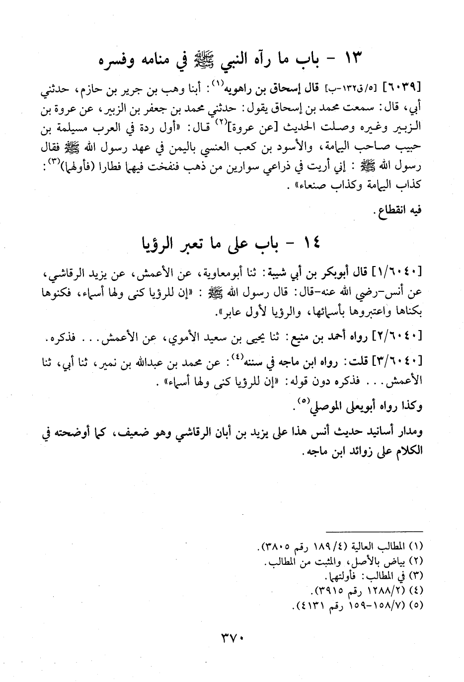 6040 / 1 - قَالَ أَبُو بَكْرِ بْنُ أَبِي شَيْبَةَ: ثَنَا أَبُو مُعَاوِيَةَ، عَنِ الْأَعْمَشِ، عَنْ يَزِيدَ الرَّقَاشِيِّ، عَنْ أَنَسٍ- رَضِيَ اللَّهُ عَنْهُ- قَالَ: قَالَ رَسُولُ اللَّهِ - صَلَّى اللَّهُ عَلَيْهِ وَسَلَّمَ -: "إِنَّ لِلرُّؤْيَا كُنًى وَلَهَا أَسْمَاءٌ، فَكَنُّوهَا بِكُنَاهَا وَاعْتَبِرُوهَا بِأَسْمَائِهَا، وَالرُّؤْيَا لِأَوَّلِ عَابِرٍ".