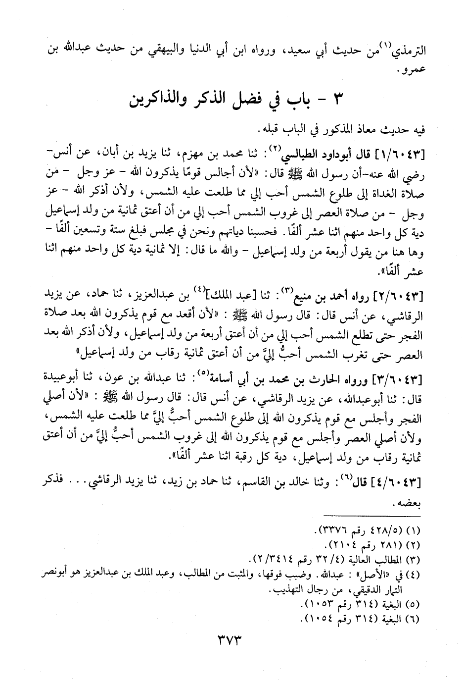 6043 / 1 - قَالَ أَبُو دَاوُدَ الطَّيَالِسِيُّ: ثَنَا مُحَمَّدُ بْنُ مهزم، ثَنَا يَزِيدُ بْنُ أَبَانٍ، عَنْ أَنَسٍ- رَضِيَ اللَّهُ عَنْهُ- أَنَّ رَسُولَ اللَّهِ - صلى الله عَلَيْهِ وَسَلَّمَ - قَالَ: "لَأَنْ أُجَالِسَ قَوْمًا يَذْكُرُونَ اللَّهَ- عَزَّ وَجَلَّ- مِنْ صَلَاةِ الْغَدَاةِ إِلَى طُلُوعِ الشَّمْسِ أَحَبُّ إِلَيَّ مِمَّا طَلَعَتْ عَلَيْهِ الشَّمْسُ، وَلَأَنْ أَذْكُرَ اللَّهَ- عَزَّ وَجَلَّ- مِنْ صَلَاةِ الْعَصْرِ إِلَى غُرُوبِ الشَّمْسِ أَحَبُّ إِلَيَّ مِنْ أَنْ أُعْتِقَ ثَمَانِيَةً مِنْ وَلَدِ إِسْمَاعِيلَ دية كل واحد منهم اثنا عشر ألفا. فَحَسْبُنَا دِيَاتُهُمْ وَنَحْنُ فِي مَجْلِسٍ فَبَلَغَ سِتَّةً وتسعين ألفاً- وها هنا مَنْ يَقُولُ أَرْبَعَةٌ مِنْ وَلَدِ إِسْمَاعِيلَ- وَاللَّهِ مَا قَالَ: إِلَّا ثَمَانِيَةً دِيَةُ كُلِّ وَاحِدٍ مِنْهُمُ اثْنَا عَشَرَ أَلْفًا".