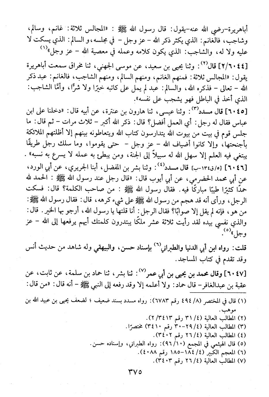 6045 - قال مسدد: وثنا عِيسَى، ثَنَا هَارُونُ بْنُ عَنْتَرَةَ، عَنْ أَبِيهِ قَالَ: "دَخَلْنَا عَلَى ابْنِ عَبَّاسٍ فَقَالَ لَهُ رَجُلٌ: أَيُّ الْعَمَلِ أَفْضَلُ؟ قَالَ: ذِكْرٌ اللَّهُ أَكْبَرُ- ثَلَاثُ مَرَّاتٍ- ثُمَّ قَالَ: مَا جَلَسَ قَوْمٌ فِي بَيْتٍ مِنْ بُيُوتِ اللَّهِ يَتَدَارَسُونَ كِتَابَ اللَّهِ وَيَتَعَاطَوْنَهُ بَيْنَهُمْ إِلَّا أَظَلَّتْهُمُ الْمَلَائِكَةُ بِأَجْنِحَتِهَا، وَإِلَّا كَانُوا أَضْيَافَ اللَّهِ- عَزَّ وَجَلَّ- حَتَّى يَقُومُوا، وَمَا سَلَكَ رَجُلٌ طَرِيقًا يَبْتَغِي فِيهِ الْعِلْمَ إِلَّا سَهَّلَ اللَّهُ لَهُ سَبِيلًا إلى الجنة، ومن يبطىء بِهِ عَمَلُهُ لَا يَسْرِعْ بِهِ نَسَبُهُ".
