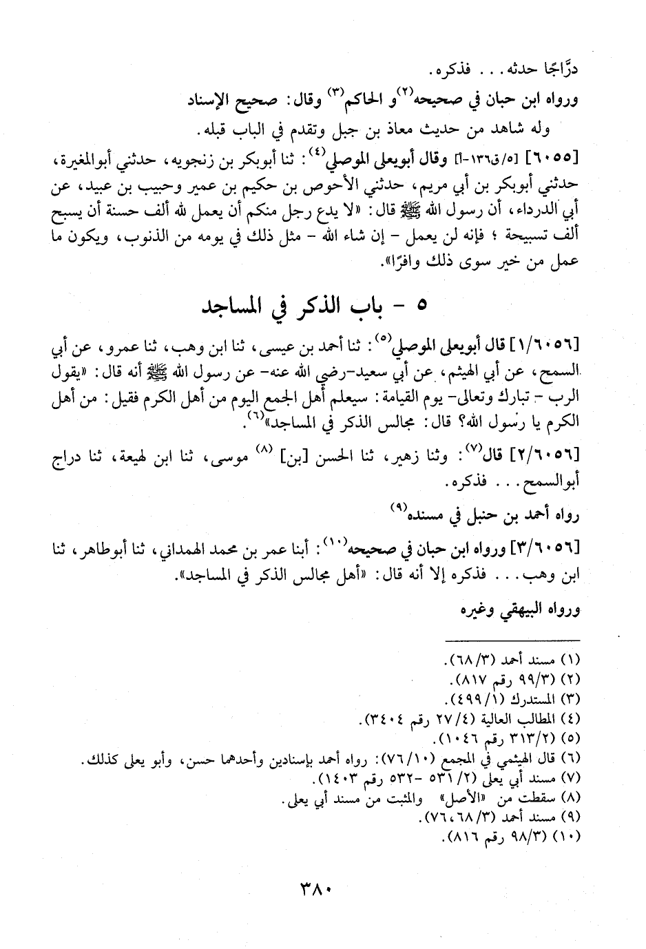 6056 / 3 - وَرَوَاهُ ابْنُ حِبَّانَ فِي صحيحه: أبنا عُمَرُ بْنُ مُحَمَّدٍ الْهَمْدَانِيُّ، ثَنَا أَبُو طَاهِرٍ، ثَنَا ابْنُ وَهْبٍ ... فَذَكَرَهُ إِلَّا أَنَّهُ قَالَ: "أَهْلُ مَجَالِسِ الذِّكْرِ فِي الْمَسَاجِدِ".