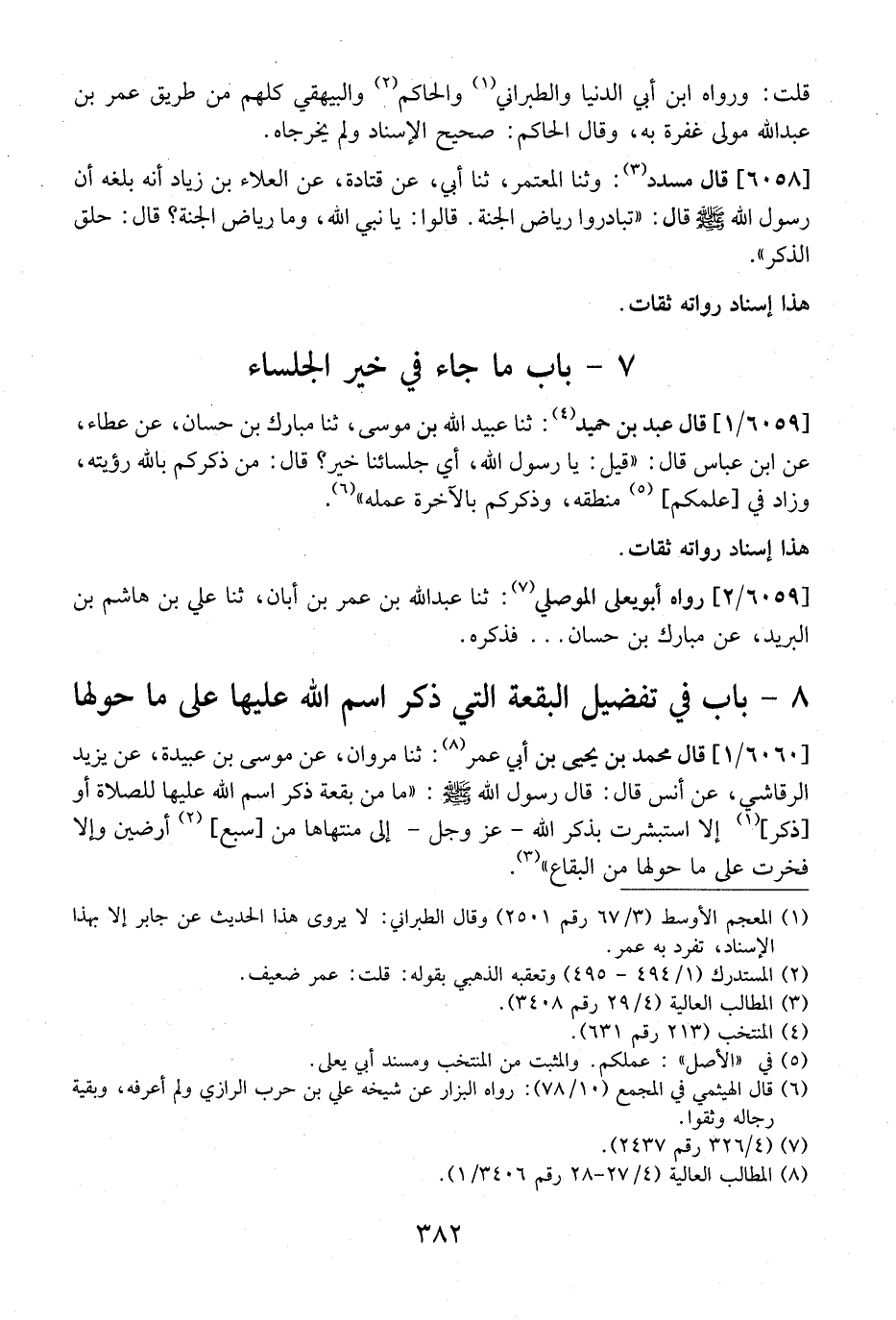 6058 - قال مسدد: وثنا الْمُعْتَمِرُ، ثَنَا أَبِي، عَنْ قَتَادَةَ، عَنِ الْعَلَاءِ بْنِ زِيَادٍ أَنَّهُ بَلَغَهُ أَنَّ رَسُولَ اللَّهِ - صَلَّى اللَّهُ عَلَيْهِ وَسَلَّمَ - قَالَ: "تَبَادَرُوا رِيَاضَ الْجَنَّةِ. قَالُوا: يَا نَبِيَّ اللَّهِ، وَمَا رِيَاضُ الْجَنَّةِ؟ قَالَ: حِلَقُ الذِّكْرِ".