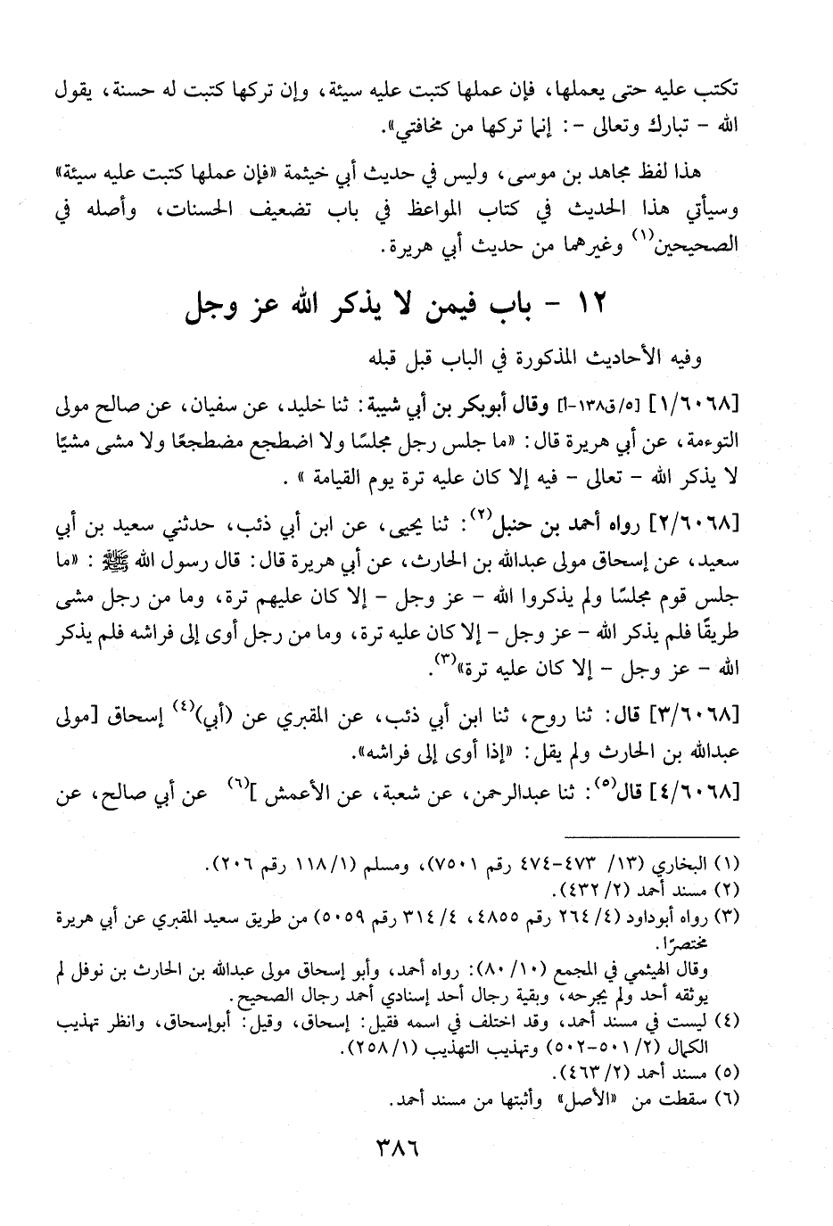 6068 / 1 - وَقَالَ أَبُو بَكْرِ بْنُ أَبِي شَيْبَةَ: ثَنَا خُلَيْدٌ، عن سفيان، عن صالح مولى التوءمة، عَنْ أَبِي هُرَيْرَةَ قَالَ: "مَا جَلَسَ رَجُلٌ مجلساً ولا اضطجع مضطجعاً ولا مشى مشياً لَا يَذْكُرُ اللَّهَ- تَعَالَى- فِيهِ إِلَّا كَانَ عَلَيْهِ تِرَةٌ يَوْمَ الْقِيَامَةِ".