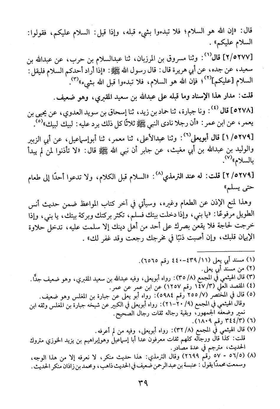5279 / 1 - قَالَ أَبُو يَعْلَى: وَثَنَا عَبْدُ الْأَعْلَى، ثَنَا معمر، ثَنَا أَبُو إِسْمَاعِيلَ، عَنْ أَبِي الزُّبَيْرِ وَالْوَلِيدِ بْنِ عَبْدِ اللَّهِ بْنِ أَبِي مُغِيثٍ، عَنْ جَابِرٍ أَنَّ نَبِيَّ اللَّهِ - صَلَّى اللَّهُ عَلَيْهِ وَسَلَّمَ - قَالَ: "لَا تَأْذَنُوا لِمَنْ لَمْ يَبْدَأْ بِالسَّلَامِ".