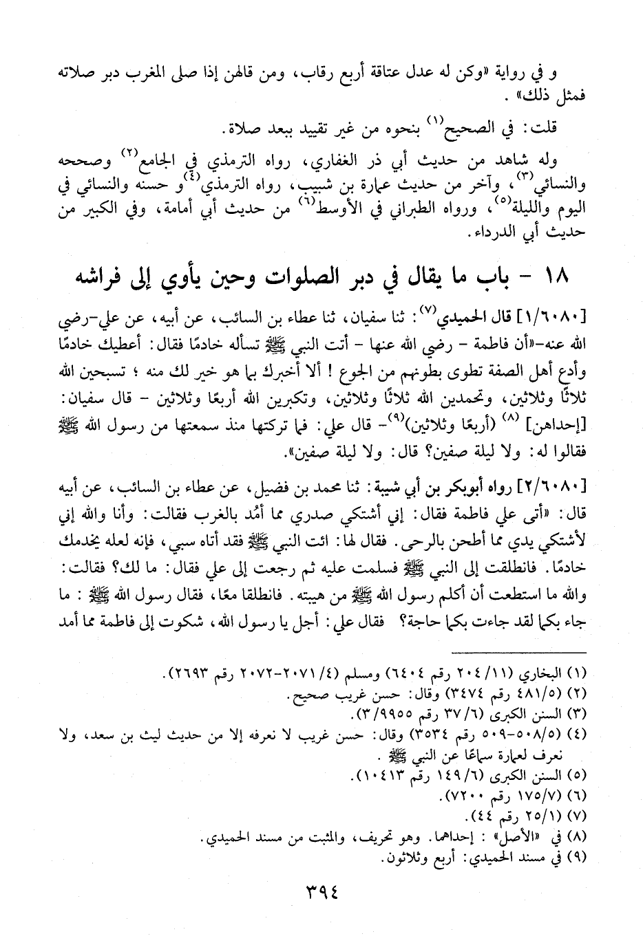 6080 / 1 - قَالَ الْحُمَيْدِيُّ: ثَنَا سُفْيَانُ، ثَنَا عَطَاءُ بْنُ السَّائِبِ، عَنْ أَبِيهِ، عَنْ عَلِيٍّ- رَضِيَ اللَّهُ عَنْهُ- "أَنَّ فَاطِمَةَ- رَضِيَ اللَّهُ عَنْهَا- أَتَتِ النَّبِيَّ - صَلَّى اللَّهُ عَلَيْهِ وَسَلَّمَ - تَسْأَلُهُ خَادِمًا فَقَالَ: أُعْطِيكِ خَادِمًا وَأَدَعُ أَهْلَ الصُّفَّةِ تُطْوَى بُطُونُهُمْ مِنَ الْجُوعِ! أَلَّا أُخْبِرُكِ بِمَا هُوَ خَيْرٌ لَكِ مِنْهُ؟ تُسَبِّحِينَ اللَّهَ ثَلَاثًا وَثَلَاثِينَ، وَتَحْمَدِينَ اللَّهَ ثَلَاثًا وَثَلَاثِينَ، وتكبرين الله أربعاً وثلاثين- قال سفيان: إحداهن أَرْبَعًا وَثَلَاثِينَ- قَالَ عَلِيٌّ: فَمَا تَرَكْتُهَا مُنْذُ سِمِعْتُهَا مِنْ رَسُولِ اللَّهِ - صَلَّى اللَّهُ عَلَيْهِ وَسَلَّمَ - فَقَالُوا لَهُ: وَلَا لَيْلَةَ صِفِّينَ؟ قَالَ: وَلَا لَيْلَةَ صِفِّينَ".