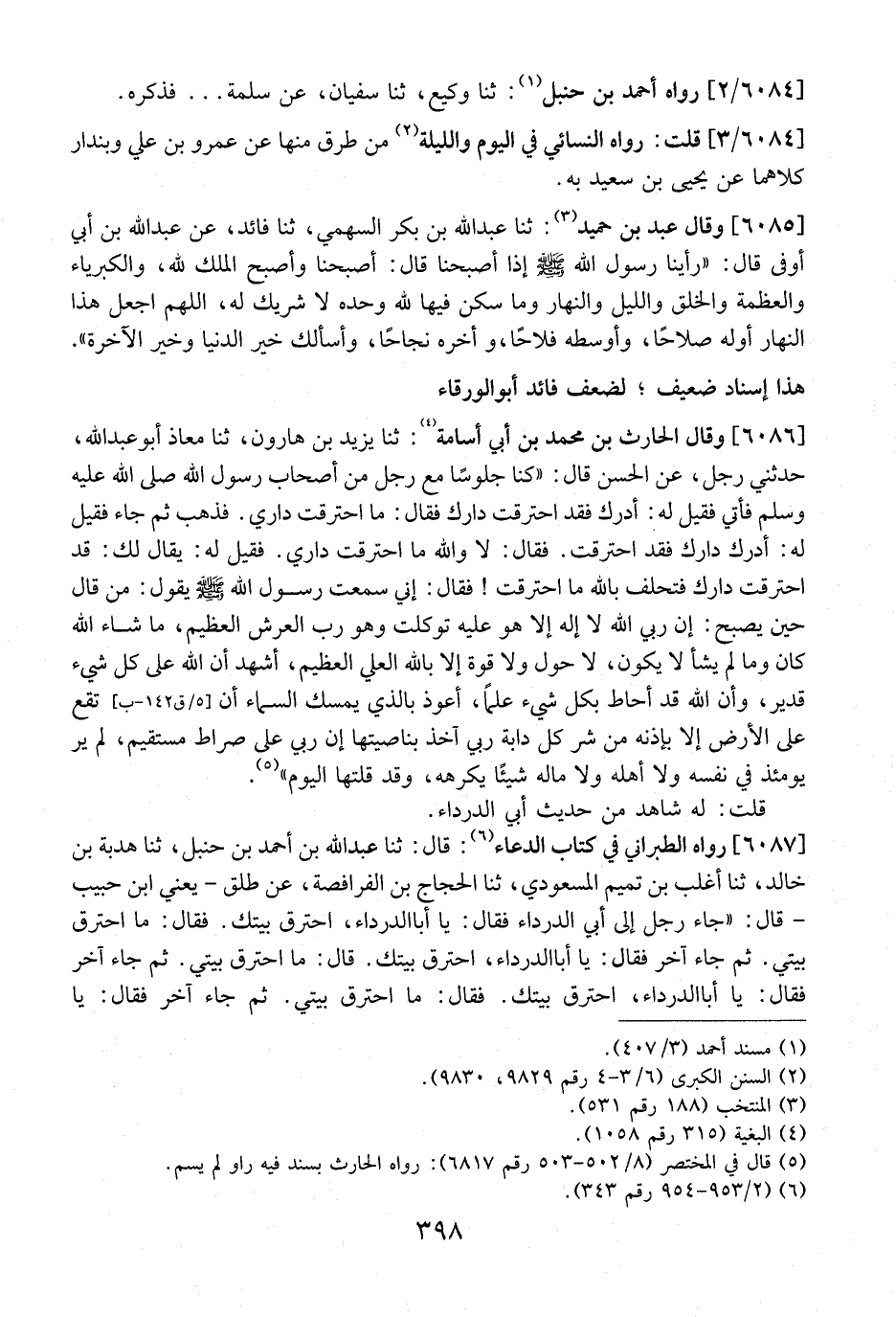 6085 - وَقَالَ عَبْدُ بْنُ حُمَيْدٍ: ثَنَا عَبْدُ اللَّهِ بْنُ بَكْرٍ السَّهْمِيُّ، ثَنَا فَائِدٌ، عَنْ عَبْدِ اللَّهِ بْنِ أَبِي أَوْفَى قَالَ: "رَأَيْنَا رَسُولُ اللَّهِ - صَلَّى اللَّهُ عَلَيْهِ وَسَلَّمَ - إِذَا أَصْبَحْنَا قَالَ: أَصْبَحْنَا وَأَصْبَحَ الْمُلْكُ لِلَّهِ، وَالْكِبْرِيَاءُ والعظمة والخلق والليل والنهار وما سكن فيها لِلَّهِ وَحْدَهُ لَا شَرِيكَ لَهُ، اللَّهُمَّ اجْعَلْ هذا النهار أوله صلاحاً، وأوسطه فلاحاً، وآخره نَجَاحًا، وَأَسْأَلُكَ خَيْرَ الدُّنْيَا وَخَيْرَ الْآخِرَةِ". هَذَا إسناد ضعيف " لضعف فائد أبو الْوَرْقَاءِ