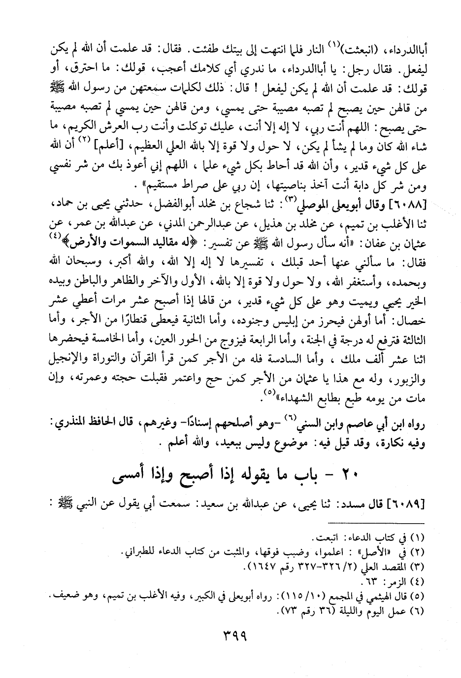 6088 - وَقَالَ أَبُو يَعْلَى الْمَوْصِلِيُّ: ثَنَا شُجَاعُ بْنُ مَخْلَدٍ أَبُو الْفَضْلِ، حَدَّثَنِي يَحْيَى بْنُ حَمَّادٍ، ثَنَا الْأَغْلَبُ بْنُ تَمِيمٍ، عَنْ مَخْلَدِ بْنِ هذيل، عَنْ عَبْدِ الرَّحْمَنِ الْمَدَنِيُّ، عَنْ عَبْدِ اللَّهِ بْنِ عُمَرَ، عَنْ عُثْمَانَ بْنِ عَفَّانَ: "أَنَّهُ سَأَلَ رَسُولَ اللَّهِ - صَلَّى اللَّهُ عَلَيْهِ وَسَلَّمَ - عن تفسير: (له مقاليد السموات والأرض) فَقَالَ: مَا سَأَلَنِي عَنْهَا أَحَدٌ قَبْلَكَ، تَفْسِيرُهَا لَا إِلَهَ إِلَّا اللَّهُ، وَاللَّهُ أَكْبَرُ، وَسُبْحَانَ اللَّهِ وَبِحَمْدِهِ، وَأَسْتَغْفِرُ اللَّهَ، وَلَا حَوْلَ وَلَا قُوَّةَ إِلَّا بِاللَّهِ، الْأَوَّلِ وَالْآخِرِ وَالظَّاهِرِ وَالْبَاطِنِ وَبِيَدِهِ الْخَيْرُ يُحْيِي وَيُمِيتُ وَهُوَ عَلَى كُلِّ شَيْءٍ قَدِيرٌ، مَنْ قَالَهَا إِذَا أَصْبَحَ عَشْرَ مرات أعطي عشر خصال: أما أولهن فيحرز مِنْ إِبْلِيسَ وَجُنُودِهِ، وَأَمَّا الثَّانِيَةُ فَيُعْطَى قِنْطَارًا مِنَ الْأَجْرِ، وَأَمَّا الثَّالِثَةَ فَتُرْفَعُ لَهُ دَرَجَةٌ فِي الْجَنَّةِ، وَأَمَّا الرَّابِعَةُ فَيُزَوَّجُ مِنَ الْحُورِ الْعِينِ، وَأَمَّا الْخَامِسَةُ فَيَحْضُرُهَا اثْنَا عَشَرَ أَلْفَ مَلَكٍ، وَأَمَّا السَّادِسَةُ فَلَهُ مِنَ الْأَجْرِ كَمَنْ قَرَأَ الْقُرْآنَ وَالتَّوْرَاةَ وَالْإِنْجِيلَ وَالزَّبُورَ، وَلَهُ مَعَ هَذَا يَا عُثْمَانُ مِنَ الْأَجْرِ كَمَنْ حَجَّ وَاعْتَمَرَ فَقُبِلَتْ حَجَّتُهُ وَعُمْرَتُهُ، وَإِنْ مَاتَ مِنْ يَوْمِهِ طُبِعَ بِطَابَعِ الشُّهَدَاءِ".