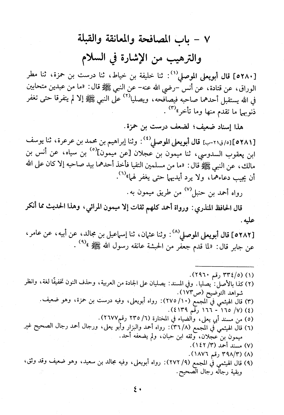 5280 - قَالَ أَبُو يَعْلَى الْمَوْصِلِيُّ: ثَنَا خَلِيفَةُ بْنُ خَيَّاطٍ، ثَنَا دُرِسْتُ بْنُ حَمْزَةَ، ثَنَا مَطَرٌ الْوَرَّاقُ، عَنْ قَتَادَةَ، عَنْ أَنَسٍ- رَضِيَ اللَّهُ عَنْهُ- عَنِ النَّبِيِّ - صَلَّى اللَّهُ عَلَيْهِ وَسَلَّمَ - قَالَ: "مَا مِنْ عَبْدَيْنِ مُتَحَابَّيْنِ فِي اللَّهِ يَسْتَقْبِلُ أَحَدُهُمَا صَاحِبَهُ فَيُصَافِحَهُ، وَيُصَلِّيَا عَلَى النَّبِيِّ - صَلَّى اللَّهُ عَلَيْهِ وَسَلَّمَ - إِلَّا لَمْ يَتَفَرَّقَا حَتَّى تُغْفَرَ ذُنُوبُهُمَا مَا تَقَدَّمَ مِنْهَا وَمَا تأخر".