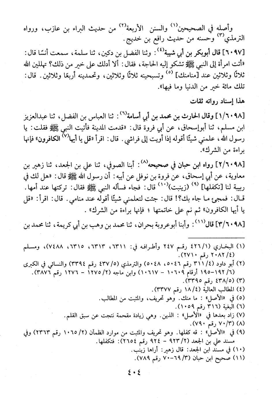 6098 / 2 - رَوَاهُ ابْنُ حبان في صحيحه: أبنا الصُّوفِيُّ، ثَنَا عَلِيُّ بْنُ الْجَعْدِ، ثَنَا زُهَيْرِ بْنِ مُعَاوِيَةَ، عَنْ أَبِي إِسْحَاقَ، عَنْ فَرْوَةَ بْنِ نَوْفَلٍ عَنْ أَبِيهِ: أَنَّ رَسُولَ اللَّهِ - صَلَّى اللَّهُ عليه وسلم - قَالَ: "هَلْ لَكَ فِي رَبِيبَةٍ لَنَا تَكْفُلُهَا زَيْنَبُ قَالَ: فَجَاءَ فَسَأَلَهُ النَّبِيُّ - صَلَّى اللَّهُ عَلَيْهِ وَسَلَّمَ - فَقَالَ: تَرَكْتُهَا عِنْدَ أُمِّهَا. قَالَ: فمجئ مَا جَاءَ بِكَ؟! قَالَ: جِئْتُ لِتُعَلِّمَنِي شَيْئًا أقوله عند منامي. قال: اقرأ: "قل يا أيها الْكَافِرُونَ" ثُمَّ نَمْ عَلَى خَاتِمَتِهَا؟ فَإِنَّهَا بَرَاءَةٌ من الشرك".