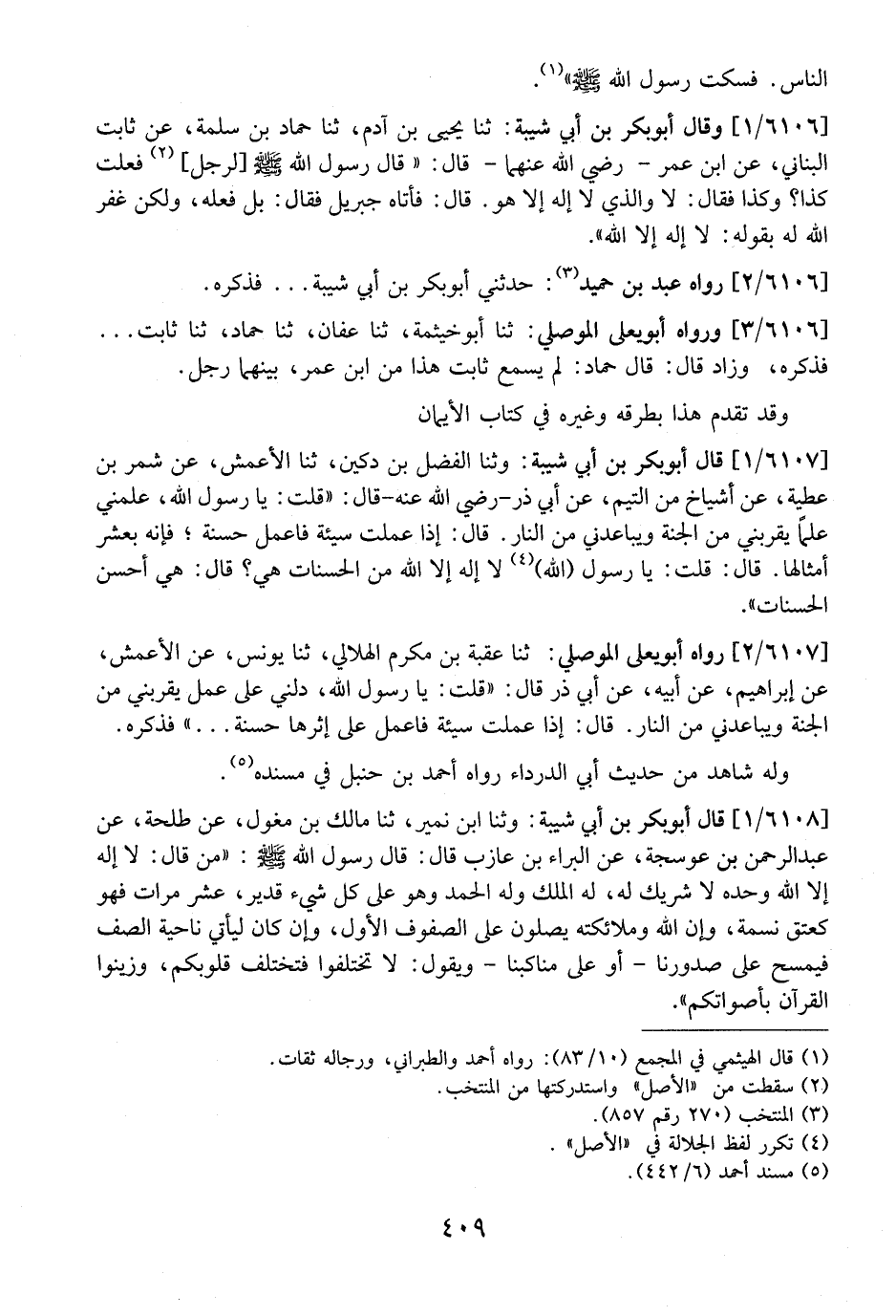 6106 / 3 - وَرَوَاهُ أَبُو يَعْلَى الْمَوْصِلِيُّ: ثَنَا أَبُو خَيْثَمَةَ، ثَنَا عَفَّانُ، ثَنَا حَمَّادٌ، ثَنَا ثَابِتٌ ... فَذَكَرَهُ، وَزَادَ قَالَ: قَالَ حَمَّادٌ: لَمْ يَسْمَعْ ثَابِتٌ هَذَا مِنَ ابْنِ عُمَرَ، بَيْنَهُمَا رَجُلٌ.