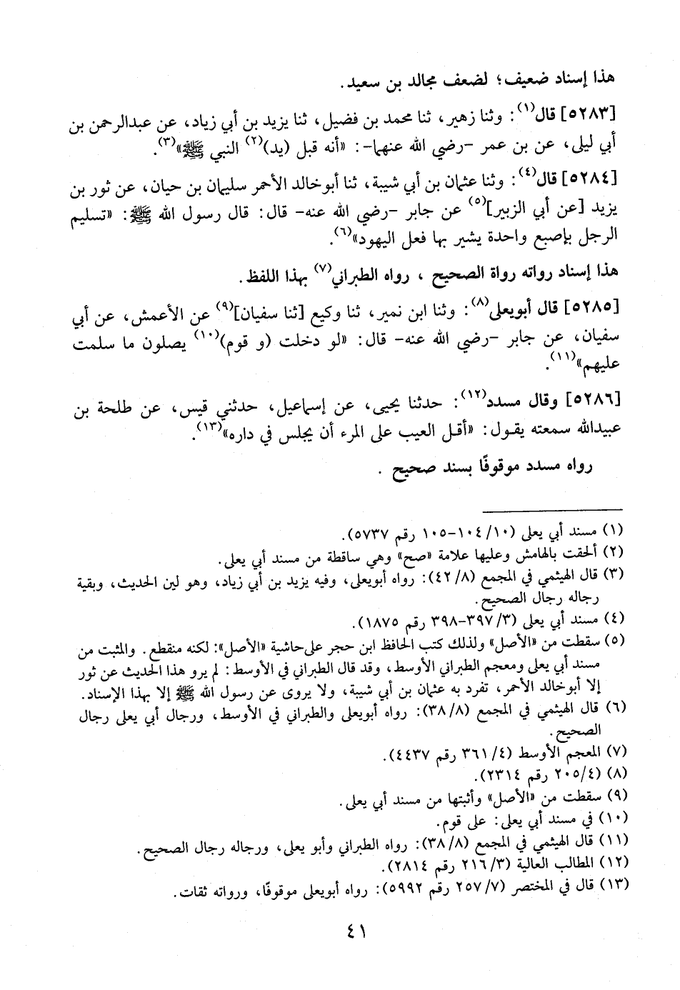 5284 - قَالَ: وَثَنَا عُثْمَانُ بْنُ أَبِي شَيْبَةَ، ثَنَا أَبُو خَالِدٍ الْأَحْمَرُ سُلَيْمَانُ بْنُ حَيَّانَ، عَنْ ثَوْرِ بْنِ يَزِيدَ عَنْ أَبيِ الزُّبَيْرِ، عَنْ جَابِرٍ- رَضِيَ اللَّهُ عَنْهُ- قَالَ: قَالَ رَسُولُ اللَّهِ - صَلَّى اللَّهُ عَلَيْهِ وَسَلَّمَ -: "تَسْلِيمُ الرَّجُلِ بِأَصْبُعٍ وَاحِدَةٍ يُشِيرُ بِهَا فِعْلُ الْيَهُودِ".