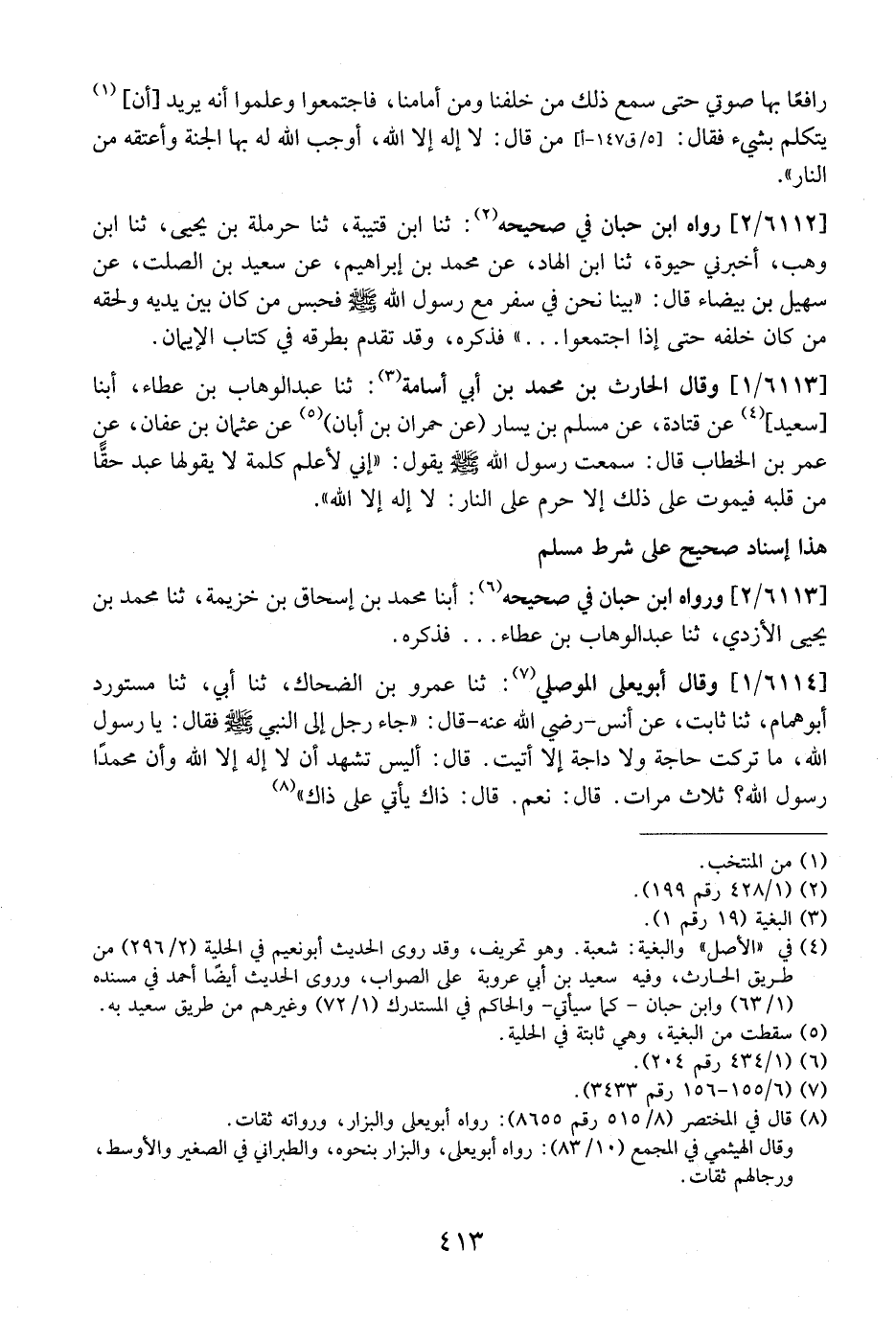6112 / 2 - رَوَاهُ ابْنُ حِبَّانَ فِي صَحِيحِهِ: ثَنَا ابْنُ قُتَيْبَةَ، ثَنَا حَرْمَلَةُ بْنُ يَحْيَى، ثَنَا ابْنُ وَهْبٍ، أَخْبَرَنِي حَيْوَةُ، ثَنَا ابْنِ الْهَادِ، عَنْ مُحَمَّدِ بْنِ إِبْرَاهِيمَ، عَنْ سَعِيدِ بْنِ الصَّلْتِ، عَنْ سُهَيْلِ بْنِ بَيْضَاءَ قال: "بَيْنَا نَحْنُ فِي سَفَرٍ مَعَ رَسُولِ اللَّهِ - صَلَّى اللَّهُ عَلَيْهِ وَسَلَّمَ - فحبس مَنْ كَانَ بَيْنَ يَدَيْهِ وَلَحِقَهُ مَنْ كَانَ خَلْفَهُ حَتَّى إِذَا اجْتَمَعُوا ... " فَذَكَرَهُ، وَقَدْ تَقَدَّمَ بِطُرُقِهِ فِي كِتَابِ الْإِيمَانِ.