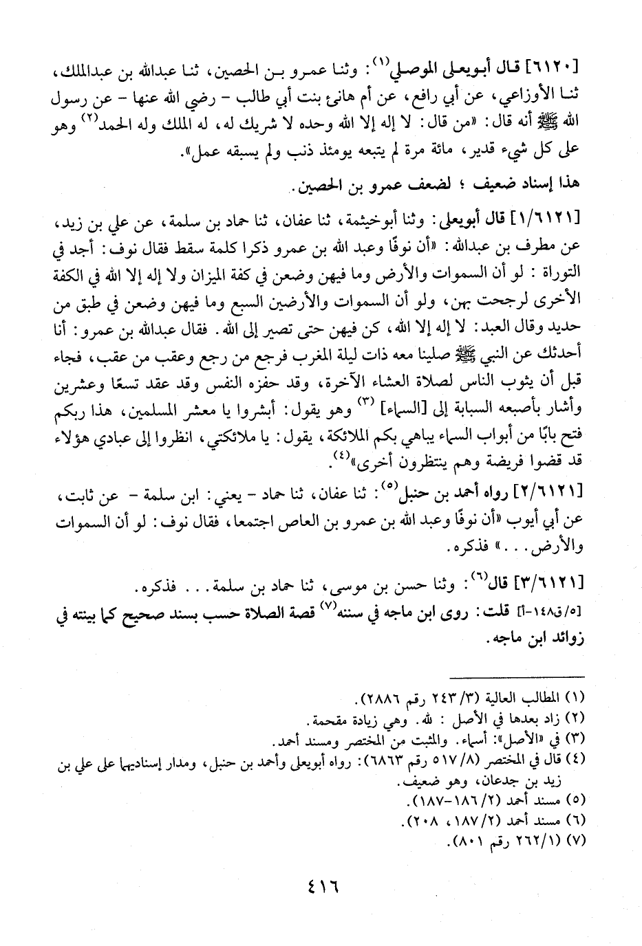 6121 / 1 - قَالَ أَبُو يَعْلَى: وَثَنَا أَبُو خَيْثَمَةَ، ثَنَا عَفَّانُ، ثَنَا حَمَّادُ بْنُ سَلَمَةَ، عَنْ عَلِيِّ بْنِ زَيْدٍ، عَنْ مُطَرِّفِ بْنِ عَبْدِ اللَّهِ: "أَنَّ نَوْفًا وَعَبْدَ اللَّهِ بْنَ عمرو ذكرا كلمة سقط فقال نوف: أجد في التوراة: لو أن السموات وَالْأَرْضَ وَمَا فِيهِنَّ وُضِعْنَ فِي كِفَّةِ الْمِيزَانِ وَلَا إِلَهَ إِلَّا اللَّهُ فِي الْكِفَّةِ الْأُخْرَى لرجحت بهن، ولو أن السموات والأرضين السبع وما فيهن وضعن في طبق من حديد وَقَالَ الْعَبْدُ: لَا إِلَهَ إِلَّا اللَّهُ، كُنَّ فِيهِنَّ حَتَّى تَصِيرَ إِلَى اللَّهِ. فَقَالَ عَبْدُ الله بن عمرو: أنا أُحَدِّثُكَ عَنِ النَّبِيِّ - صَلَّى اللَّهُ عَلَيْهِ وَسَلَّمَ - صَلَّيْنَا مَعَهُ ذَاتَ لَيْلَةٍ الْمَغْرِبَ فَرَجَعَ مَنْ رَجَعَ وَعَقَبَ مَنْ عَقَبَ، فَجَاءَ قَبْلَ أَنْ يثوب الناس لصلاة العشاء الآخرة، وقد حفزه النفس وَقَدْ عَقَدَ تِسْعًا وَعِشْرِينَ وَأَشَارَ بِإِصْبُعِهِ السَّبَّابَةِ إِلَى السَّمَاءِ، وَهُوَ يَقُولُ: أَبْشِرُوا يَا مَعْشَرَ الْمُسْلِمِينَ، هَذَا رَبُّكُمْ فَتَحَ بَابًا مِنْ أَبْوَابِ السَّمَاءِ يُبَاهِي بِكُمُ الْمَلَائِكَةَ، يَقُولُ: يَا مَلَائِكَتِي، انْظُرُوا إِلَى عِبَادِي هَؤُلَاءِ قَدْ قَضَوْا فَرِيضَةً وَهُمْ يَنْتَظِرُونَ أُخْرَى".