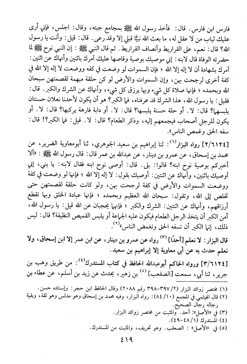6124 / 2 - رَوَاهُ الْبَزَّارُ: ثَنَا إِبْرَاهِيمُ بْنُ سَعِيدٍ الْجَوْهَرِيُّ، ثَنَا أَبُو مُعَاوِيَةُ الضَّرِيرُ، عَنْ مُحَمَّدِ بْنِ إِسْحَاقَ، عَنْ عَمْرِو بْنِ دِينَارٍ، عَنْ عَبْدِ اللَّهِ بْنِ عُمَرَ قَالَ: قَالَ رَسُولُ اللَّهِ - صَلَّى اللَّهُ عَلَيْهِ وَسَلَّمَ -: "إِلَّا أُخْبِرُكُمْ بِوَصِيَّةِ نُوحٍ ابْنَهُ؟ قالوا: بَلَى. قَالَ: أَوْصَى نُوحٌ ابْنَهُ فَقَالَ لِابْنِهِ: يَا بُنَيَّ، إِنِّي أُوصِيكَ بِاثْنَيْنِ، وَأَنْهَاكَ عَنِ اثْنَتَيْنِ: أُوصِيكَ بِقَوْلِ: لَا إِلَهَ إِلَّا اللَّهُ" فَإِنَّهَا لَو ُوُضِعَتْ فِي كِفَّةٍ وَوُضِعَتِ السَّمَوَاتُ وَالْأَرْضُ فِي كِفَّةٍ لَرَجَحَتْ بِهِنَّ، وَلَوْ كَانَتْ حلقة لقصمتهن حتى تخلص إلى الله، وتقول: سُبْحَانَ اللَّهِ الْعَظِيمِ وَبِحَمْدِهِ؟ فَإِنَّهَا عِبَادَةُ الْخَلْقِ وبها تقطع أَرْزَاقُهُمْ، وَأَنْهَاكَ عَنِ اثْنَتَيْنِ: الشَّرْكِ وَالْكِبْرِ؟ فَإِنَّهُمَا يَحْجُبَانِ عَنِ اللَّهِ قِيلَ: يَا رَسُولَ اللَّهِ، أمن الكبر أن يتخذ الرجل الطعام فيكون عليه الجماعة أو يلبس القميص النظيفة؟ قال: ليس ذلك، إنما الكبر أن تسفه الحق وتغمض الناس".