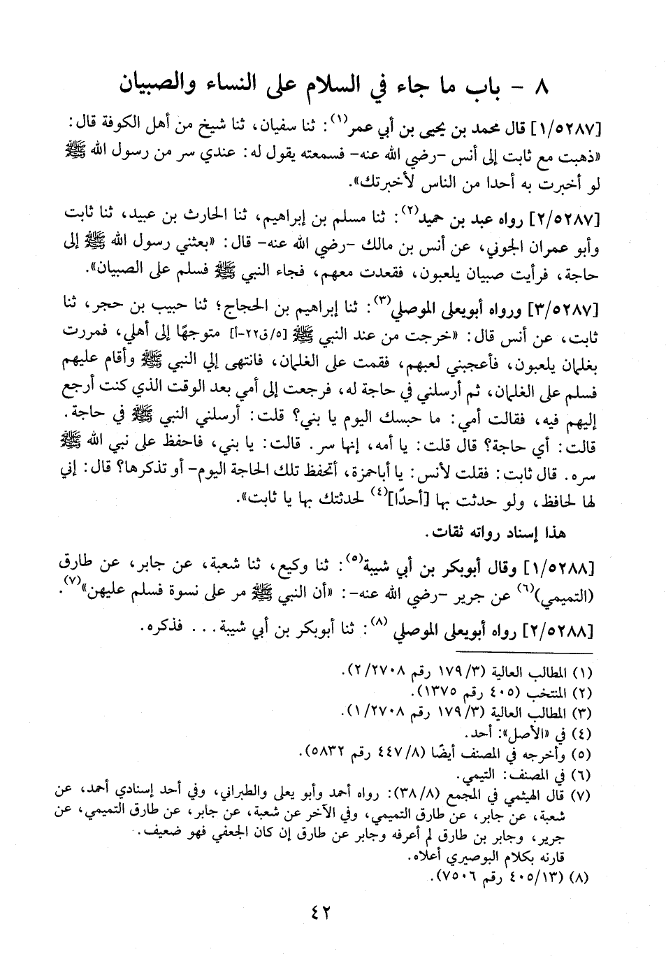 5287 / 3 - وَرَوَاهُ أَبُو يَعْلَى الْمَوْصِلِيُّ: ثَنَا إِبْرَاهِيمُ بْنُ الْحَجَّاجِ؟ ثَنَا حُبَيْبُ بْنُ حَجَرٍ، ثَنَا ثَابِتٌ، عَنْ أَنَسٍ قَالَ: "خَرَجْتُ مِنْ عِنْدِ النَّبِيِّ - صَلَّى اللَّهُ عَلَيْهِ وَسَلَّمَ - مُتَوَجِّهًا إِلَى أَهْلِي، فَمَرَرْتُ بِغِلْمَانٍ يَلْعَبُونَ، فَأَعْجَبَنِي لَعِبُهُمْ، فَقُمْتُ عَلَى الْغِلْمَانِ، فَانْتَهَى إِلَيَّ النَّبِيُّ - صَلَّى اللَّهُ عَلَيْهِ وَسَلَّمَ - وأقام عَلَيْهِمْ فَسَلَّمَ عَلَى الْغِلْمَانِ، ثُمَّ أَرْسَلَنِي فِي حاجة له، فَرَجَعْتُ إِلَى أُمِّي بَعْدَ الْوَقْتِ الَّذِي كُنْتُ أَرْجَعُ إِلَيْهِمْ فِيهِ، فَقَالَتْ أُمِّي: مَا حَبَسَكَ الْيَوْمَ يَا بُنِيَّ؟ قُلْتُ: أَرْسَلَنِي النَّبِيُّ - صَلَّى اللَّهُ عَلَيْهِ وَسَلَّمَ - فِي حَاجَةٍ. قَالَتْ: أَيُّ حاجة؟ قال: قلت: يا أمه، إنها سِرٌّ. قَالَتْ: يَا بُنِيَّ، فَاحْفَظْ عَلَى نَبِيِّ اللَّهِ - صَلَّى اللَّهُ عَلَيْهِ وَسَلَّمَ - سِرَّهُ. قَالَ ثابت: فقلت لأنس: يا أبا حمزة، أتحفظ تِلْكَ الْحَاجَةَ الْيَوْمَ- أَوْ تَذْكُرُهَا؟ قَالَ: إِنِّي لَهَا لَحَافِظٌ، وَلَوْ حَدَّثْتُ بِهَا أَحَدًا، لَحَدَّثْتُكَ بها يَا ثَابِتُ".