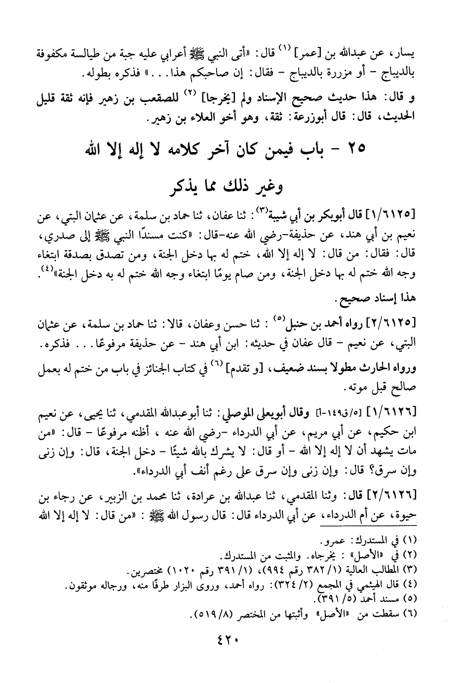 6125 / 1 - قَالَ أَبُو بَكْرِ بْنُ أَبِي شَيْبَةَ: ثَنَا عَفَّانُ، ثَنَا حَمَّادُ بْنُ سَلَمَةَ، عَنْ عُثْمَانَ الْبَتِّيِّ، عَنْ نُعَيْمِ بْنِ أَبِي هِنْدٍ، عَنْ حُذَيْفَةَ- رَضِيَ اللَّهُ عَنْهُ- قَالَ: "كُنْتُ مُسْنِدًا النَّبِيَّ - صَلَّى اللَّهُ عَلَيْهِ وَسَلَّمَ - إِلَى صَدْرِي، قَالَ: فَقَالَ: مَنْ قَالَ: لَا إِلَهَ إِلَّا اللَّهُ، خُتِمَ لَهُ بِهَا دَخَلَ الْجَنَّةَ، وَمَنْ تَصَدَّقَ بِصَدَقَةٍ ابْتِغَاءَ وَجْهِ اللَّهِ خُتِمَ لَهُ بِهَا دَخَلَ الْجَنَّةَ، وَمَنْ صَامَ يَوْمًا ابْتِغَاءَ وَجْهِ اللَّهِ خُتِمَ لَهُ بِهِ دَخَلَ الْجَنَّةَ". هَذَا إِسْنَادٌ صَحِيحٌ.