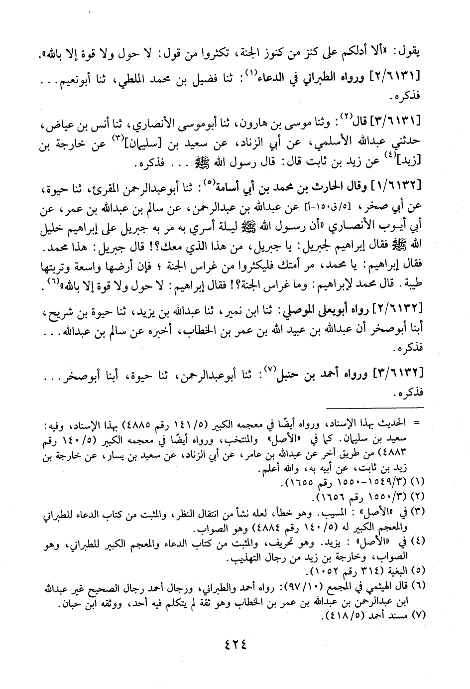 6132 / 1 - وَقَالَ الْحَارِثُ بْنُ مُحَمَّدِ بْنِ أَبِي أُسَامَةَ: ثنا أَبُو عَبْدِ الرَّحْمَنِ الْمُقْرِئُ، ثَنَا حَيَوَةُ، عَنْ أَبِي صَخْرٍ، عَنْ عَبْدِ اللَّهِ بْنِ عَبْدِ الرَّحْمَنِ، عَنْ سَالِمِ بْنِ عَبْدِ اللَّهِ بْنِ عُمَرَ، عَنْ أَبِي أَيُّوبَ الْأَنْصَارِيِّ "أَنَّ رَسُولَ اللَّهِ - صَلَّى اللَّهُ عَلَيْهِ وَسَلَّمَ - لَيْلَةَ أُسْرِيَ بِهِ مَرَّ بِهِ جِبْرِيلُ عَلَى إِبْرَاهِيمَ خَلِيلِ اللَّهِ - صَلَّى اللَّهُ عَلَيْهِ وَسَلَّمَ - فَقَالَ إِبْرَاهِيمُ لِجِبْرِيلَ: يَا جِبْرِيلُ، مَنْ هَذَا الَّذِي مَعَكَ؟! قَالَ جِبْرِيلُ: هَذَا مُحَمَّدٌ. فَقَالَ إِبْرَاهِيمُ: يَا مُحَمَّدُ، مُرْ أُمَّتَكَ فَلْيُكْثِرُوا مِنْ غِرَاسِ الْجَنَّةِ؟ فَإِنَّ أَرْضَهَا وَاسِعَةٌ وَتُرْبَتَهَا طَيِّبَةٌ. قَالَ مُحَمَّدٌ لِإِبْرَاهِيمَ: وَمَا غِرَاسُ الْجَنَّةِ؟! فَقَالَ إِبْرَاهِيمُ: لَا حَوْلَ وَلَا قُوَّةَ إِلَّا بِاللَّهِ".