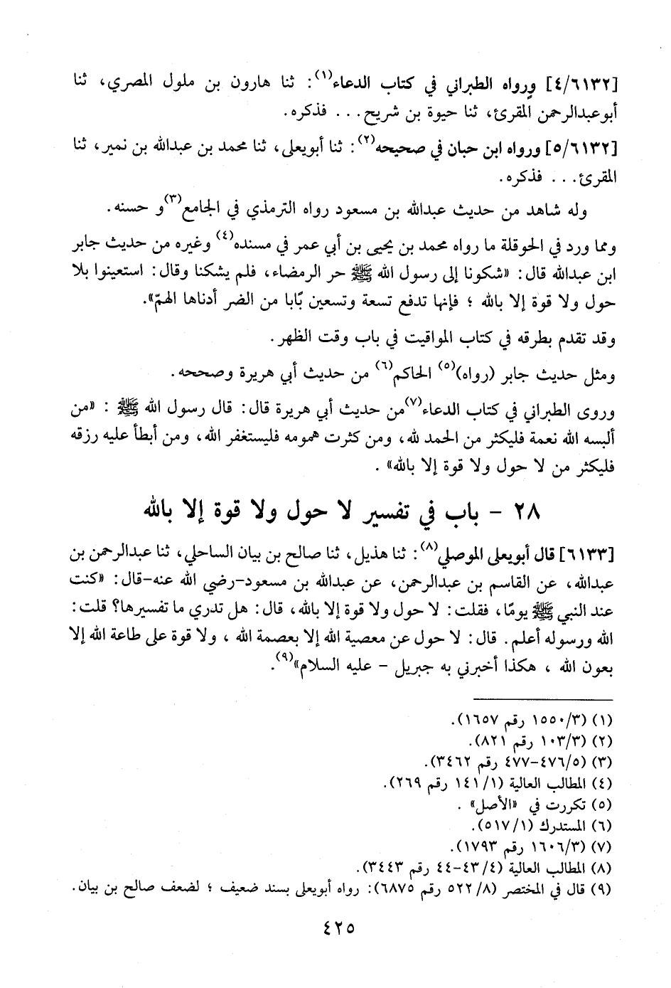 6133 - قَالَ أَبُو يَعْلَى الْمُوصِلِيُّ: ثَنَا هُذَيْلٌ، ثَنَا صَالِحُ بْنُ بَيَانٍ السَّاحِلِيُّ، ثَنَا عَبْدُ الرَّحْمَنِ بْنُ عَبْدِ اللَّهِ، عَنِ الْقَاسِمِ بْنِ عَبْدِ الرَّحْمَنِ، عَنْ عَبْدِ اللَّهِ بْنِ مَسْعُودٍ- رَضِيَ اللَّهُ عَنْهُ- قَالَ: "كُنْتُ عِنْدَ النَّبِيِّ - صَلَّى اللَّهُ عَلَيْهِ وَسَلَّمَ - يومًا، فَقُلْتُ: لَا حَوْلَ وَلَا قُوَّةَ إِلَّا بِاللَّهِ، قَالَ: هَلْ تَدْرِي مَا تَفْسِيرُهَا؟ قُلْتُ: اللَّهُ وَرَسُولُهُ أَعْلَمُ. قَالَ: لَا حَوْلَ عَنْ مَعْصِيَةِ اللَّهِ إِلَّا بِعِصْمَةِ اللَّهِ، وَلَا قُوَّةَ عَلَى طَاعَةِ اللَّهِ إِلَّا بِعَوْنِ اللَّهِ، هَكَذَا أَخْبَرَنِي بِهِ جِبْرِيلُ- عَلَيْهِ السَّلَامُ".
