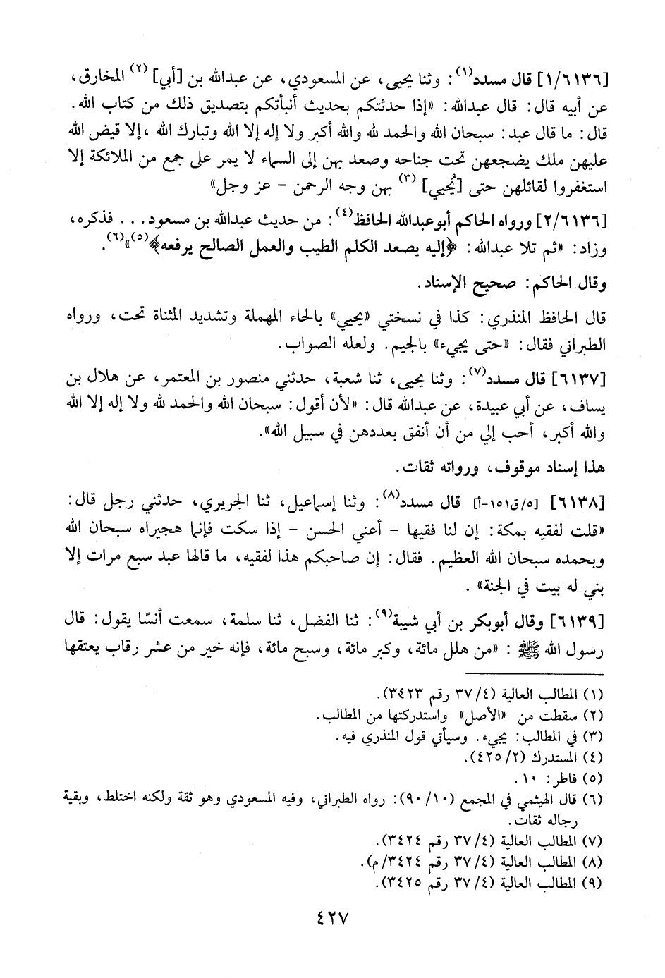 6137 - قَالَ مُسَدَّدٌ: وَثَنَا يَحْيَى، ثَنَا شُعْبَةُ، حَدَّثَنِي مَنْصُورِ بْنِ الْمُعْتَمِرِ، عَنْ هِلَالِ بْنِ يَسَافٍ، عَنْ أَبِي عُبَيْدَةَ، عَنْ عَبْدِ اللَّهِ قَالَ: "لَأَنْ أَقُولَ: سُبْحَانَ اللَّهِ وَالْحَمْدُ لِلَّهِ وَلَا إِلَهَ إِلَّا اللَّهُ وَاللَّهُ أكبر، أحب إلي من أن أُنْفِقَ بِعَدَدِهِنَّ فِي سَبِيلِ اللَّهِ".