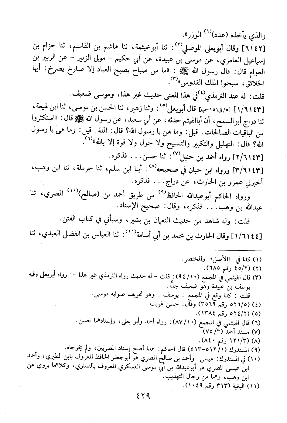 6143 / 1 - قَالَ أَبُو يَعْلَى: وَثَنَا زُهَيْرٌ، ثَنَا الْحَسَنُ بْنُ مُوسَى، ثَنَا ابْنُ لَهِيعَةَ، ثَنَا دَرَّاجُ أَبُو السَّمْحِ، أَنَّ أَبَا الْهَيْثَمِ حَدَّثَهُ، عَنْ أَبِي سَعِيدٍ، عَنْ رَسُولِ اللَّهِ - صَلَّى اللَّهُ عَلَيْهِ وَسَلَّمَ - قَالَ: "اسْتَكْثِرُوا مِنَ الْبَاقِيَاتِ الصَّالِحَاتِ. قِيلَ: وَمَا هُنَّ يَا رَسُولَ اللَّهِ؟ قَالَ: الملة. قِيلَ: وَمَا هِيَ يَا رَسُولَ اللَّهِ؟ قَالَ: التَّهْلِيلُ وَالتَّكْبِيرُ وَالتَّسْبِيحُ وَلَا حَوْلَ وَلَا قُوَّةَ إِلَّا بِاللَّهِ".