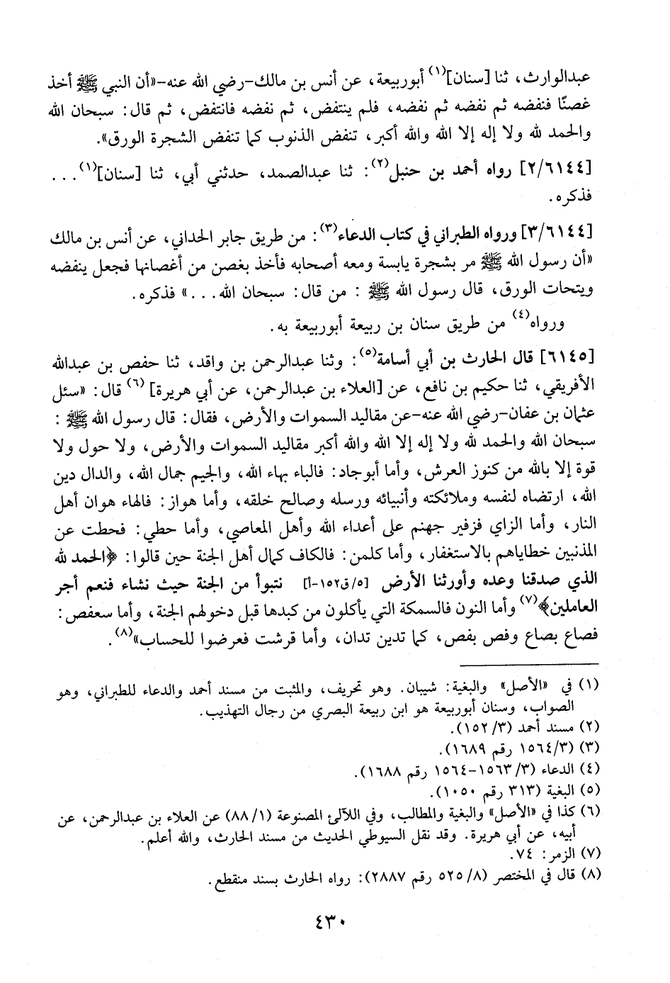 6144 / 3 - وَرَوَاهُ الطَّبَرَانِيُّ فِي كِتَابِ الدُّعَاءِ: مِنْ طَرِيقِ جابر الحداني، عَنْ أَنَسِ بْنِ مَالِكٍ "أَنّ رَسُولَ اللَّهِ - صلى الله عليه وسلم - مر بشجرة يابسة ومعه أصحابه فأخذ بغصن من أغصانها فجعل ينفضه ويتحات الورق، قال رسول الله - صلى الله عليه وسلم -: من قال: سبحان الله ... " فذكره.