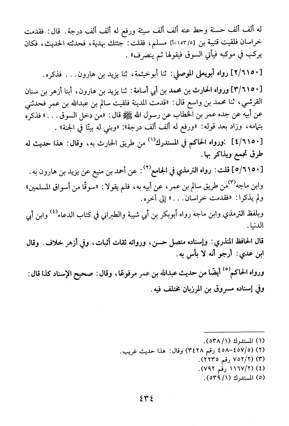 6150 / 5 - قُلْتُ: رَوَاهُ التِّرْمِذِيُّ فِي الْجَامِعِ: عَنْ أَحْمَدَ بْنِ مَنِيعٍ عَنْ يَزِيدَ بْنِ هَارُونَ بِهِ. وابن ماجه مِنْ طَرِيقِ سَالِمِ بْنِ عُمَرَ، عَنْ أَبِيهِ بِهِ، فَلَمْ يَقُولَا: "سُوقًا مِنْ أَسْوَاقِ الْمُسْلِمِينَ" وَلَمْ يَذْكُرَا: "فَقَدِمْتُ خُرَاسَانَ ... " إِلَى آخِرِهِ.