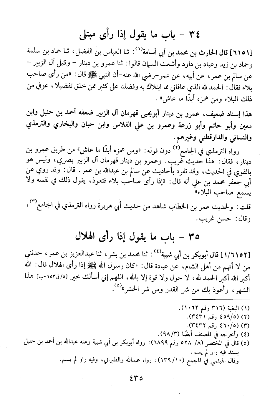 6151 - قَالَ الْحَارِثُ بْنُ مُحَمَّدِ بْنِ أَبِي أُسَامَةَ: ثنا الْعَبَّاسُ بْنُ الْفَضْلِ، ثَنَا حَمَّادُ بْنُ سَلَمَةَ وَحَمَّادُ بْنُ زَيْدٍ وَعَبَّادُ بْنُ دَاوُدَ وَأَشْعَثُ السَّمَّانُ قَالُوا: ثَنَا عَمْرُو بْنُ دِينَارٍ- وَكِيلُ آل الزبير- عن سالم بْنِ عُمَرَ، عَنْ أَبِيهِ، عَنْ عُمَرَ- رَضِيَ اللَّهُ عَنْهُ- أَنّ النَّبِيَّ - صَلَّى اللَّهُ عليه وَسَلَّمَ - قَالَ: "مَنْ رَأَى صَاحِبَ بَلَاءٍ فَقَالَ: الْحَمْدُ لِلَّهِ الَّذِي عَافَانِي مِمَّا ابْتَلَاكَ بِهِ وَفَضَّلَنَا عَلَى كَثِيرٍ مِمَّنْ خَلَقَ تَفْضِيلًا، عُوفِيَ مِنْ ذَلِكَ الْبَلَاءِ وَمِنْ هَمْزِهِ أَبَدًا مَا عَاشَ".
