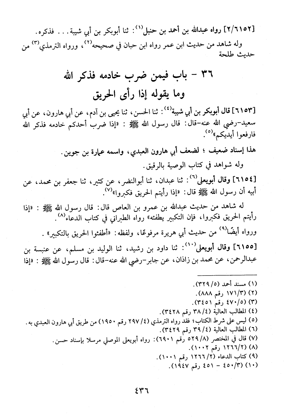 6154 - وقال أبو يعلى: ثَنَا عَبْدَانُ، ثَنَا أَبُو النَّضْرِ، عَنْ كَثِيرٍ، ثَنَا جَعْفَرِ بْنِ مُحَمَّدٍ، عَنْ أَبِيهِ أَنَّ رَسُولَ اللَّهِ - صَلَّى اللَّهُ عَلَيْهِ وَسَلَّمَ - قَالَ: "إِذَا رَأَيْتُمُ الْحَرِيقَ فَكَبِّرُوا".