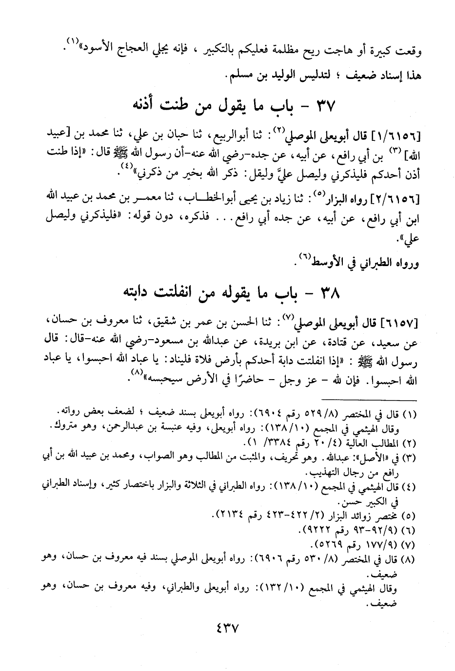 6156 / 1 - قَالَ أَبُو يَعْلَى الْمَوْصِلِيُّ: ثَنَا أَبُو الرَّبِيعِ، ثَنَا حِبَّانُ بْنُ عَلِيٍّ، ثَنَا مُحَمَّدُ بْنُ عُبَيْدِ اللَّهِ بْنِ أَبِي رَافِعٍ، عَنْ أَبِيهِ، عَنْ جَدِّهِ- رَضِيَ اللَّهُ عَنْهُ- أَنّ رَسُولَ اللَّهِ - صَلَّى اللَّهُ عَلَيْهِ وَسَلَّمَ - قَالَ: "إِذَا طَنَّتْ أذن أحدكم فليذكرني وليصل عليَّ وَلْيَقُلْ: ذَكَرَ اللَّهُ بِخَيْرٍ مَنْ ذَكَرَنِي".