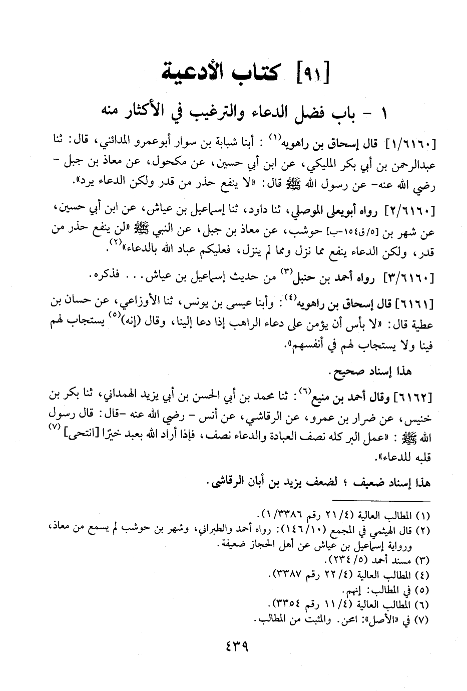 6162 - وَقَالَ أَحْمَدُ بْنُ مَنِيعٍ: ثَنَا مُحَمَّدُ بْنُ أَبِي الْحَسَنِ بْنِ أَبِي يَزِيدَ الْهَمْدَانِيُّ، ثَنَا بَكْرُ بْنُ خُنَيْسٍ، عَنْ ضِرَارِ بْنِ عَمْرٍو، عَنِ الرَّقَاشِيِّ، عَنْ أَنَسٍ- رَضِيَ اللَّهُ عَنْهُ- قَالَ: قَالَ رَسُولُ اللَّهِ - صَلَّى اللَّهُ عَلَيْهِ وَسَلَّمَ -: "عَمِلَ الْبِرِّ كُلُّهُ نِصْفُ الْعِبَادَةِ وَالدُّعَاءُ نصف، فإذا أراد الله بعبد خيراً انتهى قَلْبَهُ لِلدُّعَاءِ".